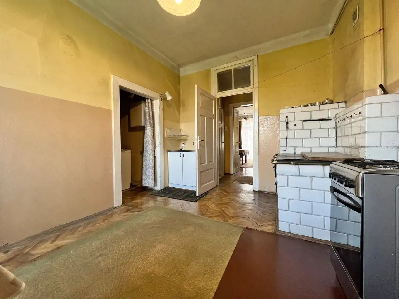 The apartment is three-sided, bright (windows facing east, north, and south), spacious, consisting of 2 adjoining rooms, a bright kitchen with two pantries, a bathroom with a toilet, and a hallway. The premises require renovation. Parquet flooring in the rooms. The apartment includes a balcony facing south. Exclusive use of cellar space (approx. 10m2). Heating from tile stoves converted to gas, hot water from a gas heater. Electricity, water, and gas charges according to meters, as well as garbage collection fees. No building manager.