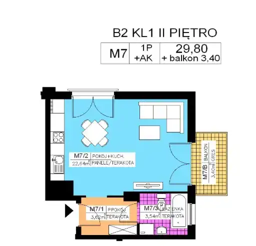 - Charakterystyka mieszkania 29.8 m2, 1 pokój