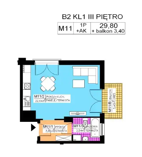 - Charakterystyka mieszkania 29.8 m2, 1 pokój