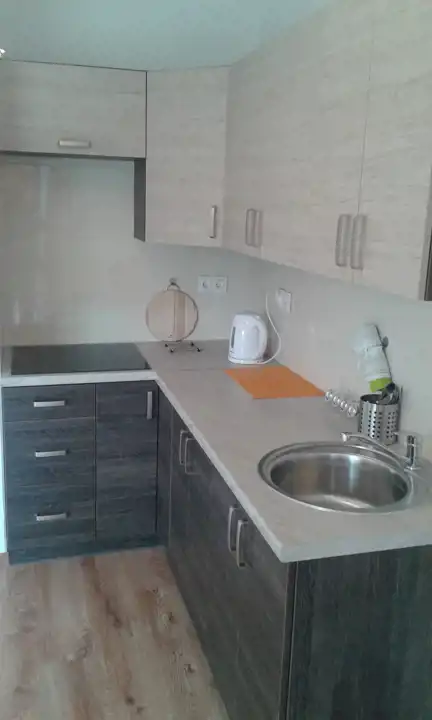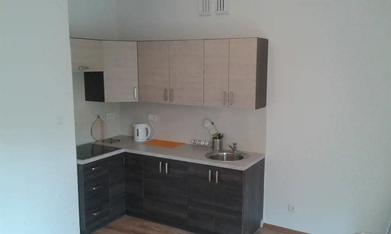 The apartment is single-sided and comes equipped with a fitted kitchen (including refrigerator, washing machine, ceramic hob), a wardrobe, and a shower.