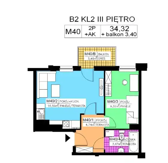 - Charakterystyka mieszkania 34.32 m2, 2 pokoje