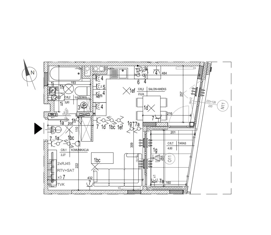 - salon z aneksem kuchennym (23,04 m2),