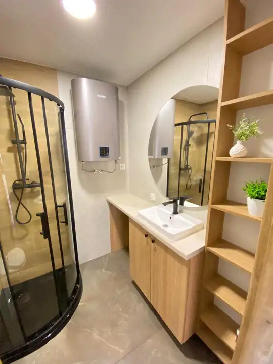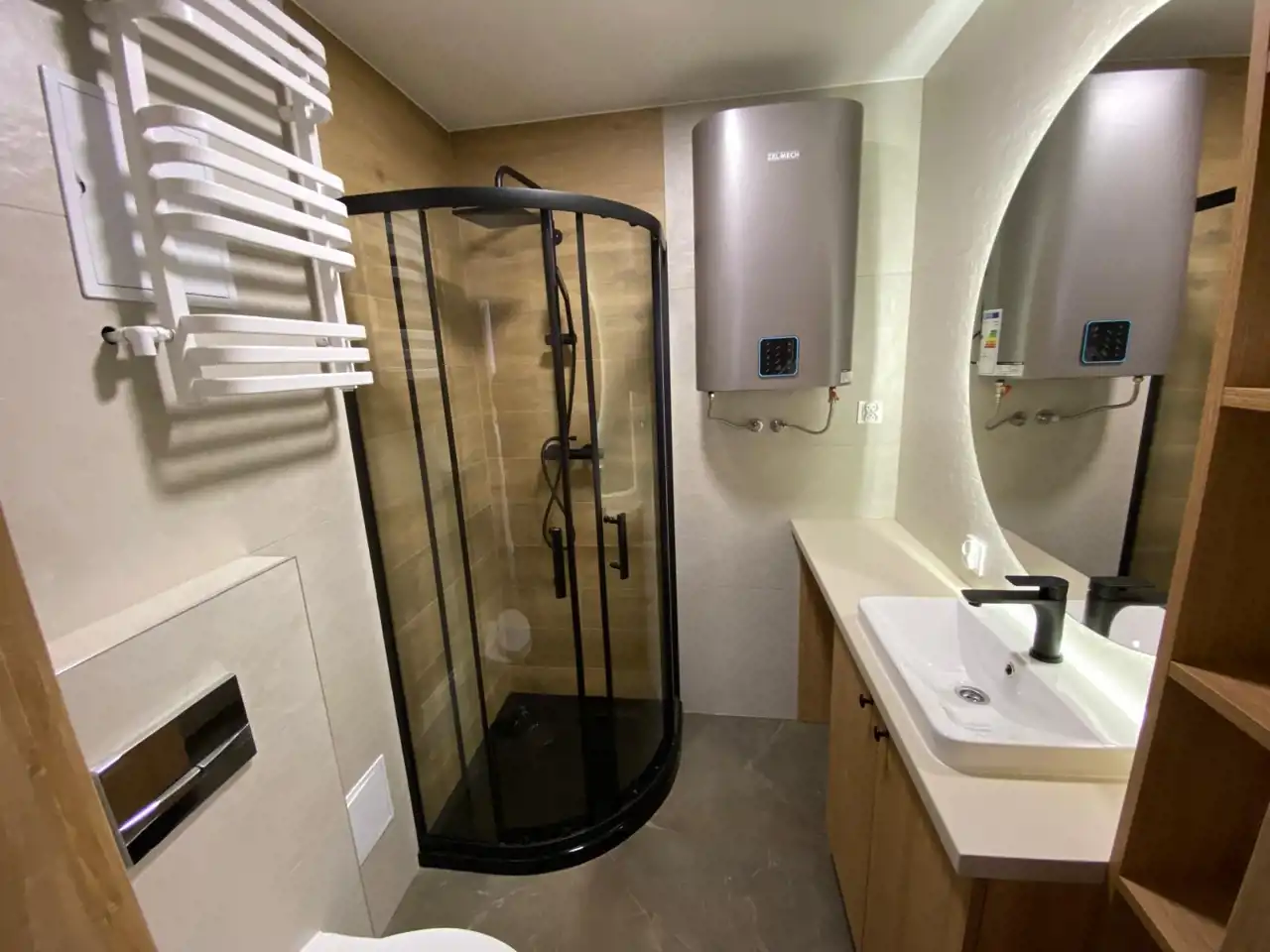 Łazienka jest wyposażona w prysznic, duże podświetlane lustro, a na podłodze i ścianach położone są płytki. W mieszkaniu znajdują duże okna PCV.