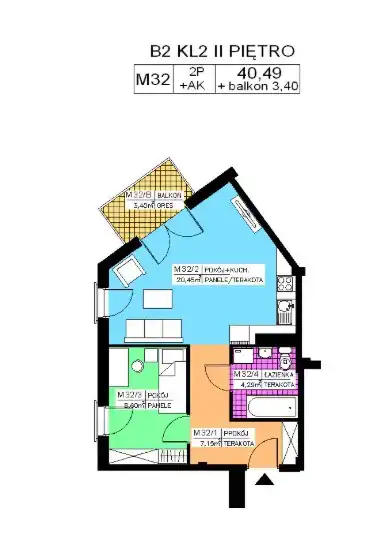 - Charakterystyka mieszkania 40.49 m2, 2 pokoje