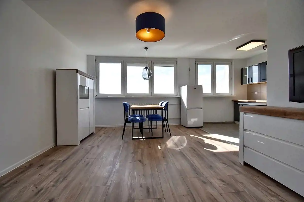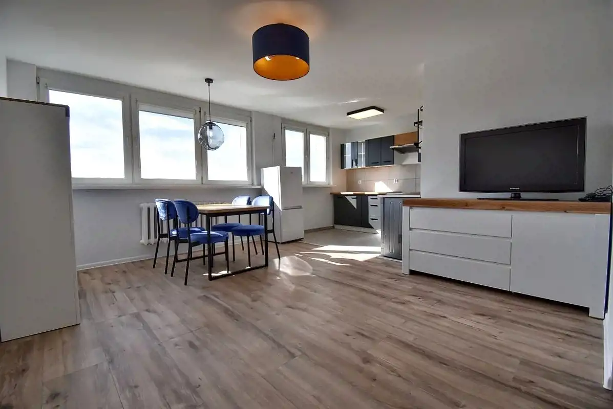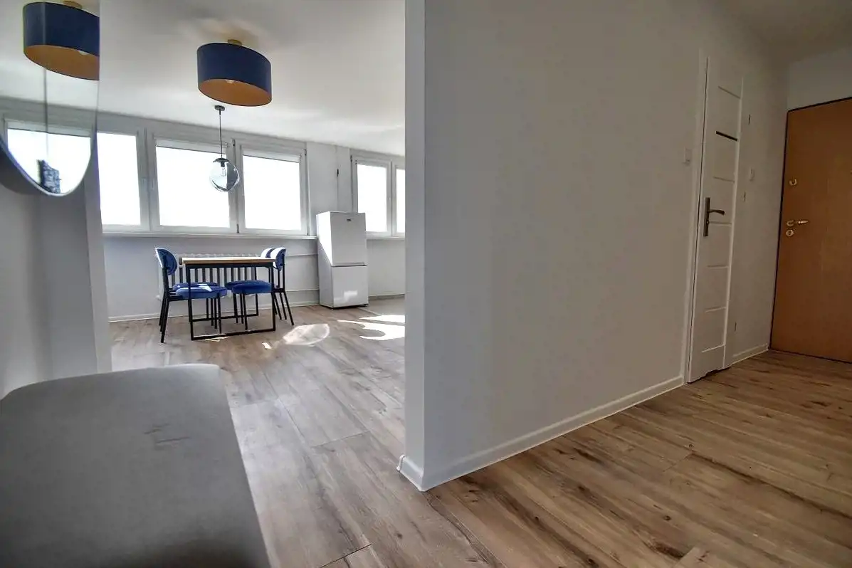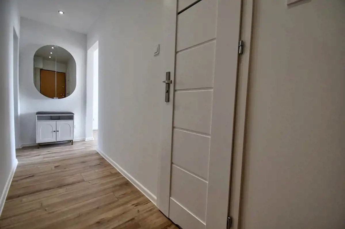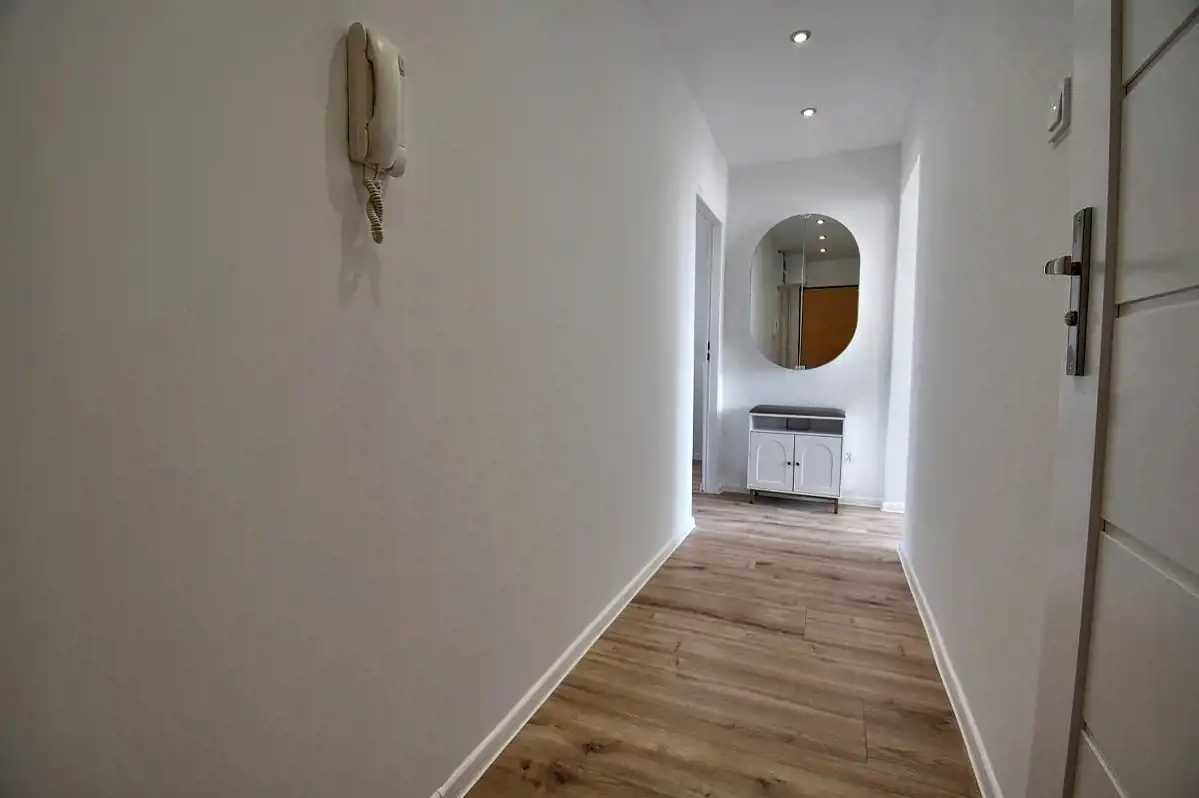 The apartment is dual aspect and bright (east-west exposure). PVC window frames. The floors in the kitchen and bathroom are tiled, and in the rooms and hallway are laminate panels. Heating is provided by the municipal network, and hot water by a gas heater. The apartment is in move-in condition, after a general renovation in 2024. All installations (plumbing and electrical) were replaced, new plaster and floors were laid. The block in which the property is located underwent thermal modernization in 2023 (the building and roof were insulated).