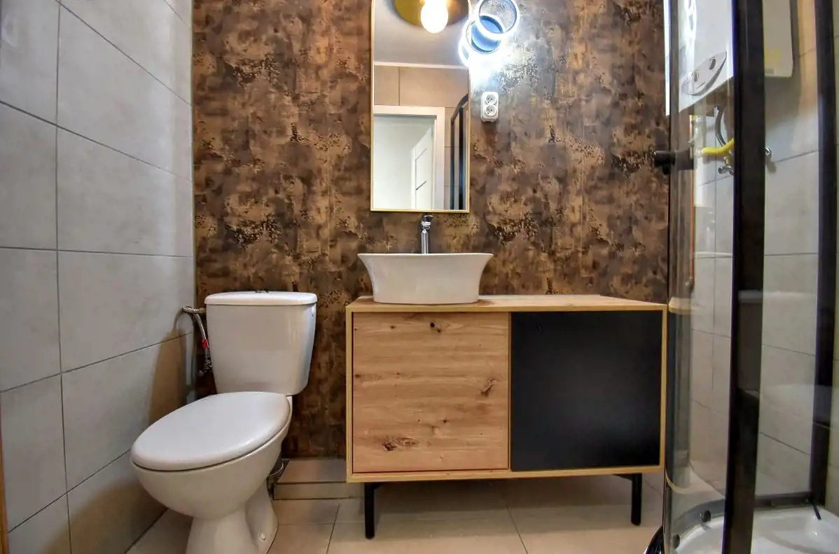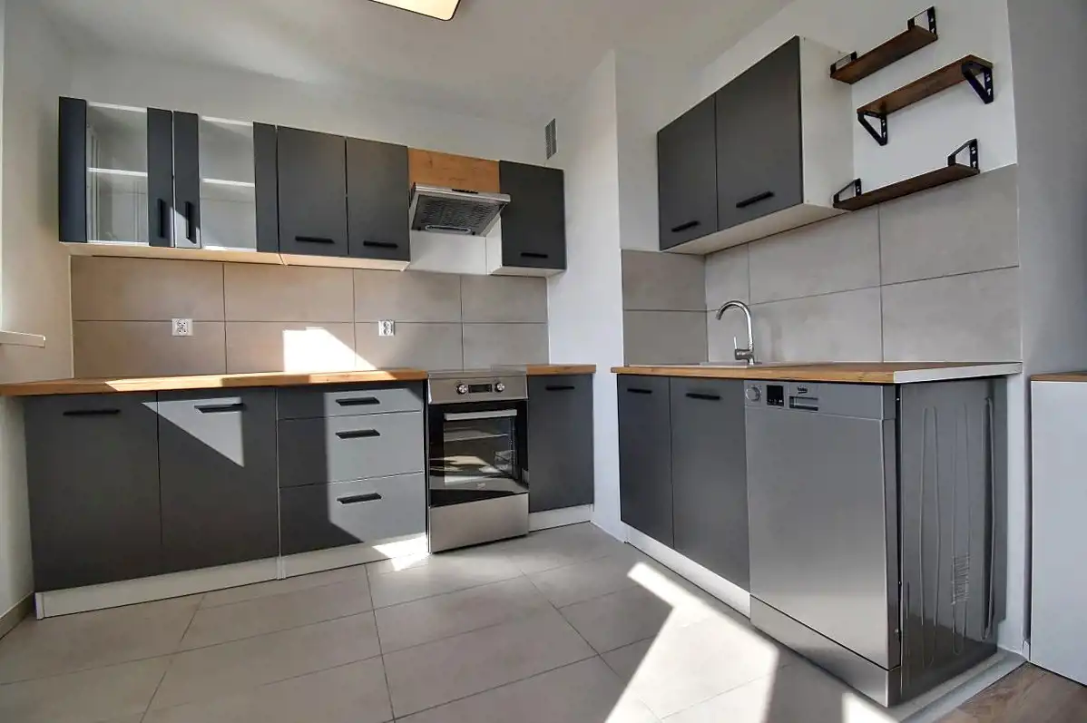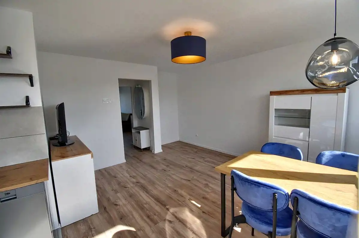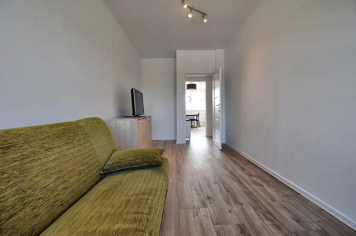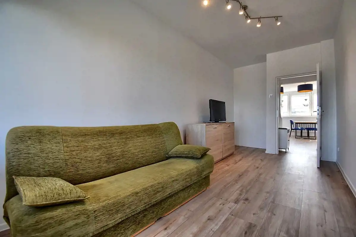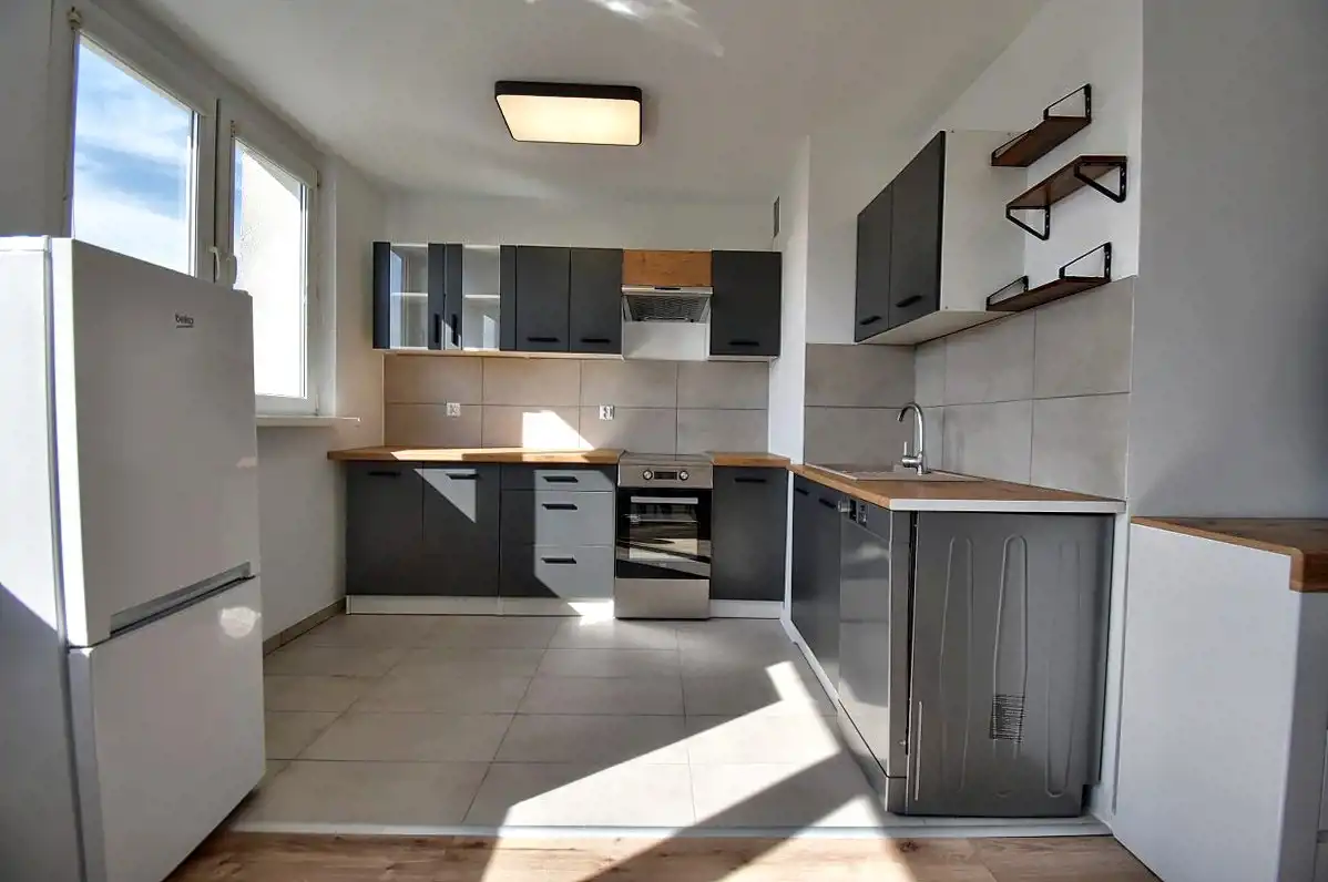 The apartment is dual aspect and bright (east-west exposure). PVC window frames. The floors in the kitchen and bathroom are tiled, and in the rooms and hallway are laminate panels. Heating is provided by the municipal network, and hot water by a gas heater. The apartment is in move-in condition, after a general renovation in 2024. All installations (plumbing and electrical) were replaced, new plaster and floors were laid. The block in which the property is located underwent thermal modernization in 2023 (the building and roof were insulated).