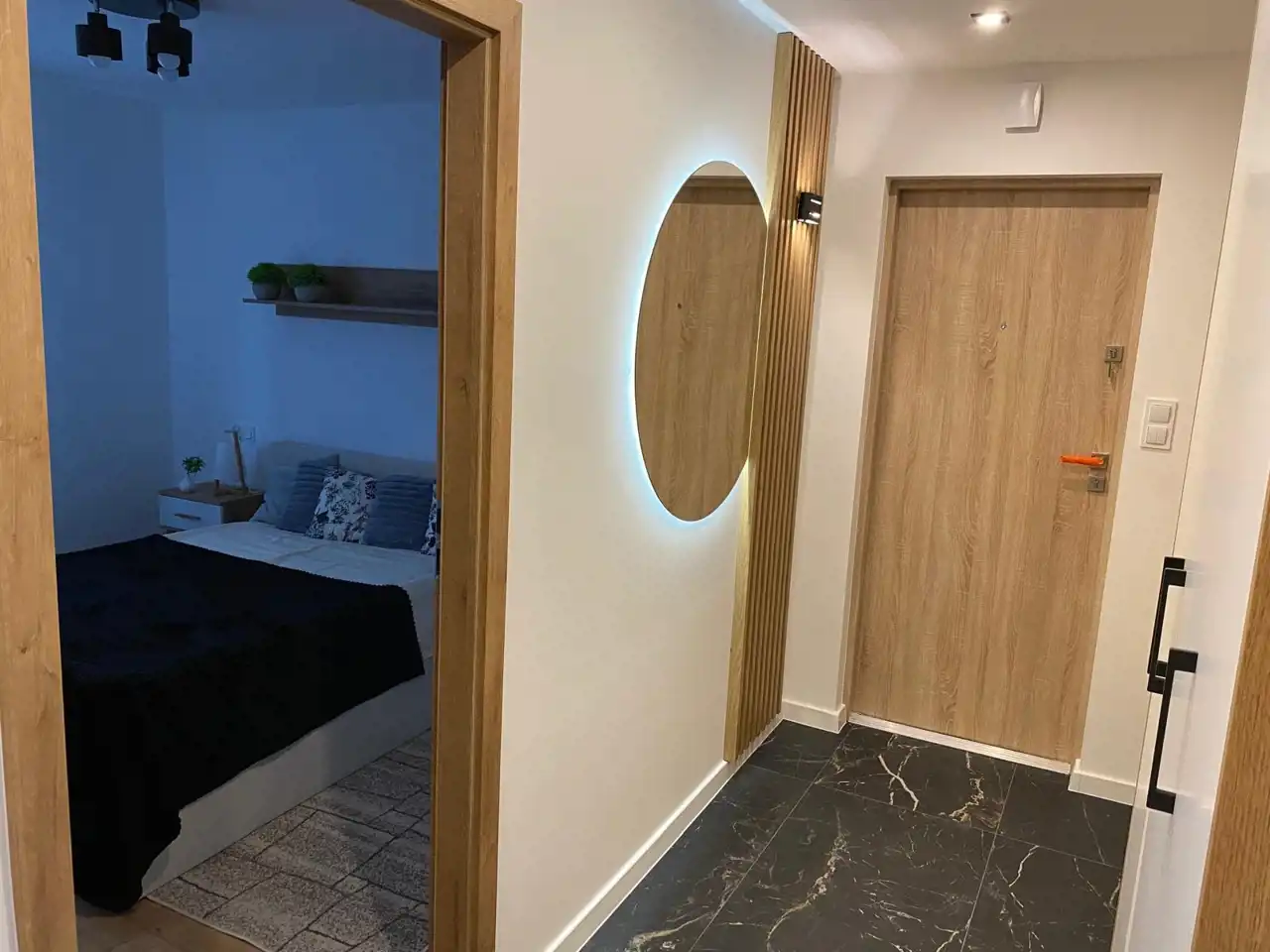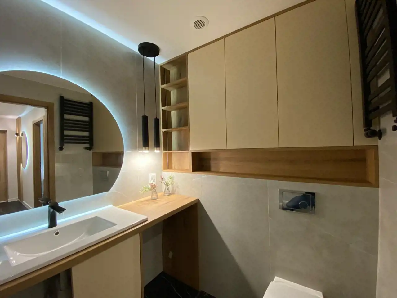 Łazienka jest wyposażona w prysznic, duże podświetlane lustro, a na podłodze i ścianach położone są płytki. W mieszkaniu znajdują duże okna PCV. Wszystkie drzwi zostały wymienione.
