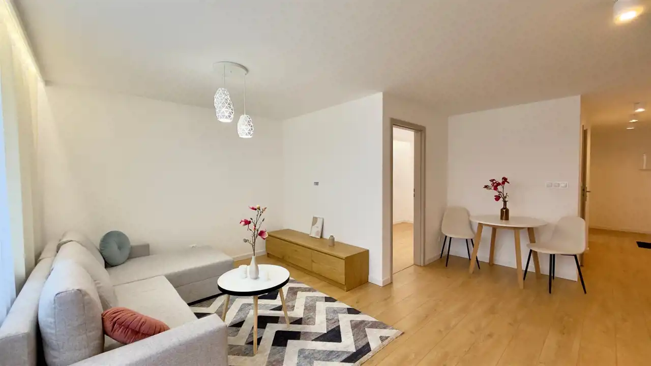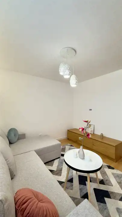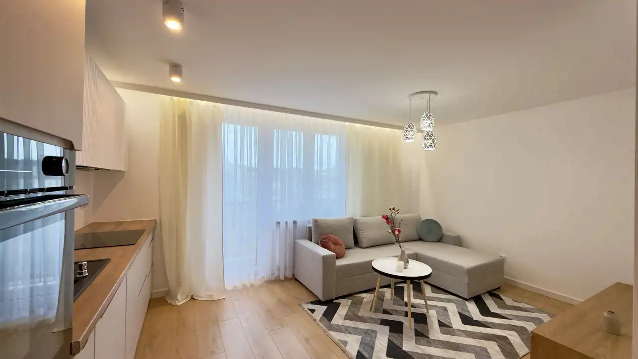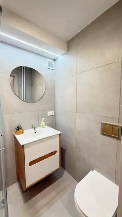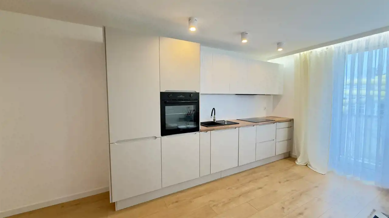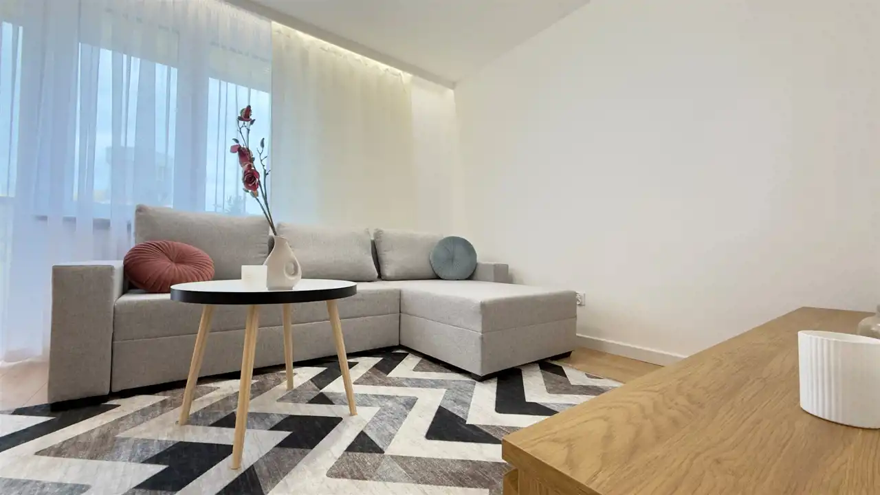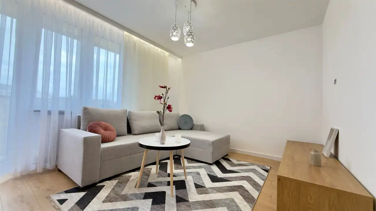 W mieszkaniu znajduje się, duży salon z aneksem kuchennym w której została wykonana zabudowa meblowa. Zainstalowano wszelkie niezbędne sprzęty AGD znanych marek tj: okap, piekarnik elektryczny, płyta indukcyjna oraz zmywarka. Salon umeblowany w narożnik, stolik oraz szafkę RTV. Łazienka w mieszkaniu została zaprojektowana w nowoczesnym stylu. Zainstalowano w niej wysokiej klasy armaturę oraz energooszczędne i modne oświetlenie LED. Do wykończenia mieszkania zostały użyte wysokogatunkowe materiały w nowoczesnym stylu: świetnej jakości farby w jasnych kolorach, panele o wysokiej klasie oraz energooszczędne i modne oświetlenie.
