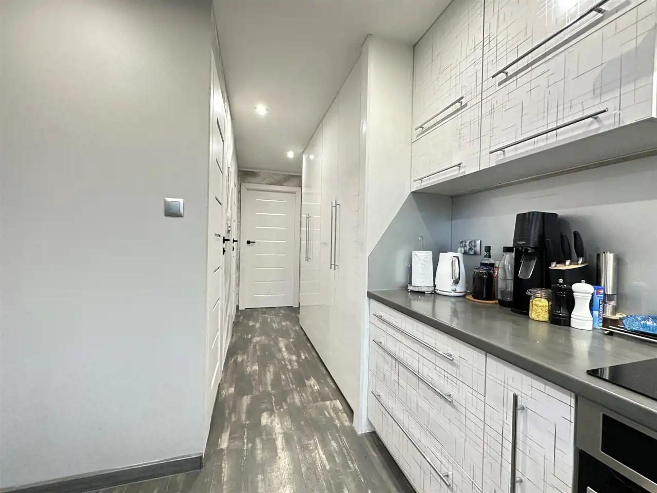 - wykonanie zabudowy meblowej na wymiar przez stolarza w kuchni, łazience oraz przedpokoju