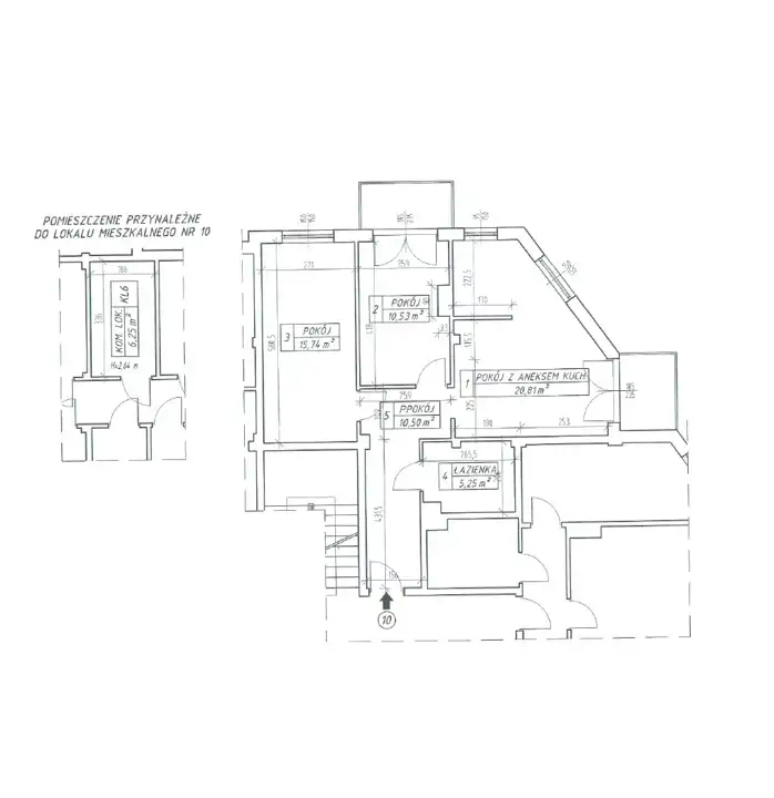 b) 2 pokoje (pow.10,53 m2, 15,74 m2),