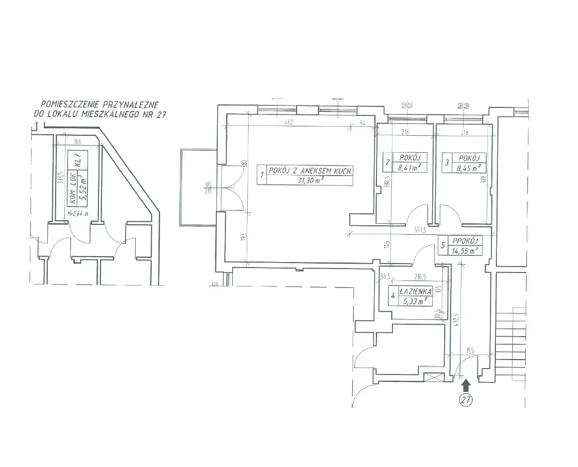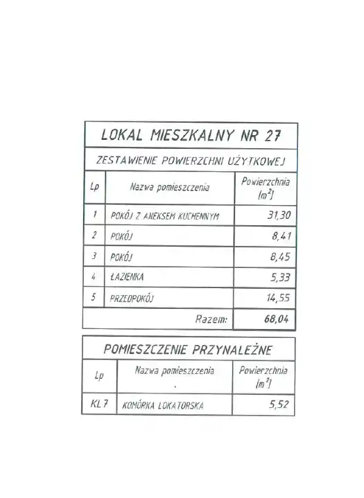Do mieszkania przynależy komórka lokatorska o pow. 5,52 m2.