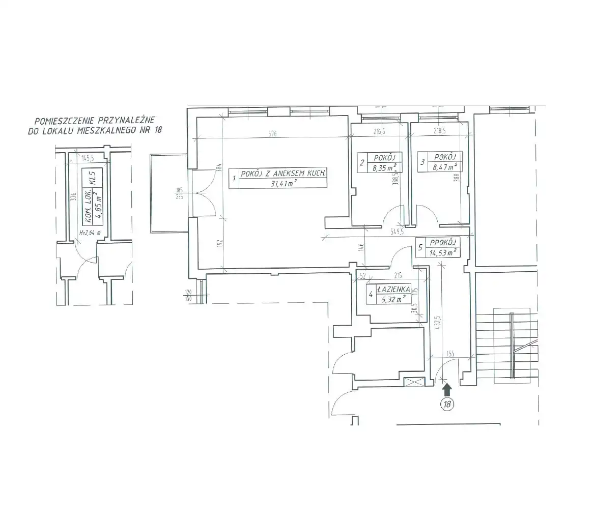 Do mieszkania przynależy komórka lokatorska o pow. 4,85 m2.