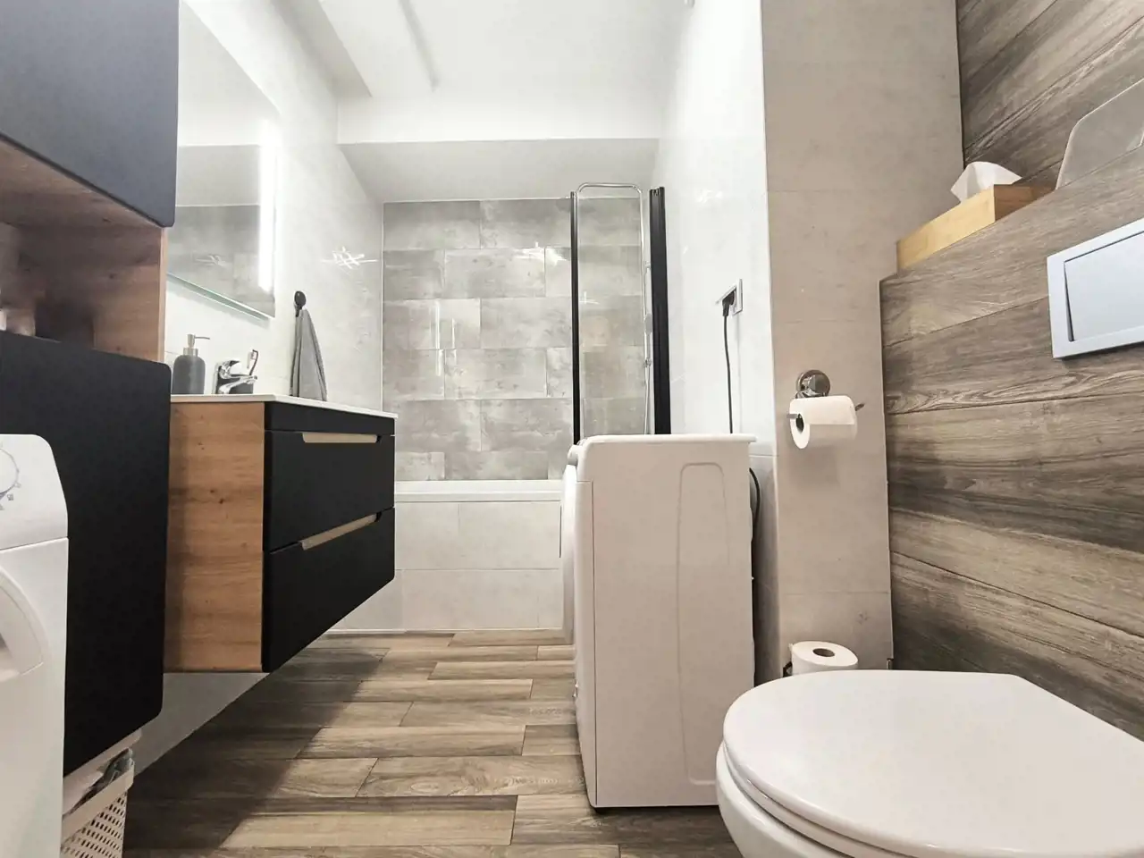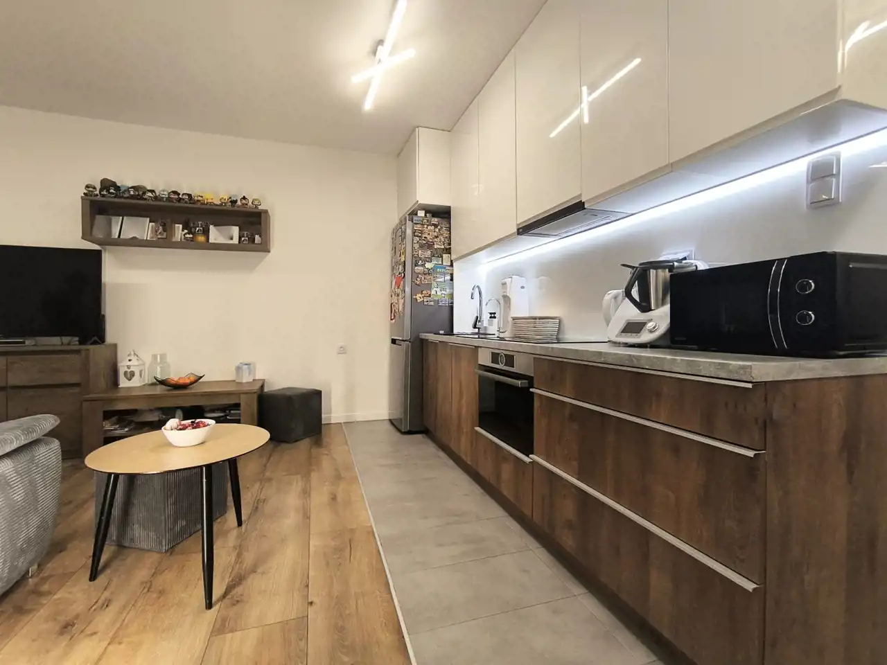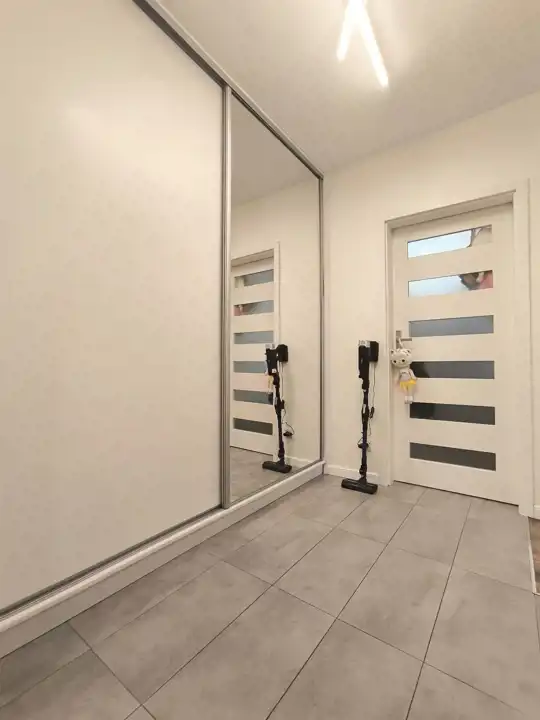 W skład mieszkania wchodzi salon z aneksem kuchennym, sypialnia, łazienka z WC oraz przedpokój. Dodatkową powierzchnię stanowi duży, bo aż dziewięciometrowy balkon. Mieszkanie wykończone kilka lat temu. Odświeżone w ubiegłym roku. Na ścianach gładzie, na podłodze w pokojach panele AC5 8 mm; w łazience terakota, w przedpokoju gres. Na wyposażeniu łazienki podwieszane WC, wanna z funkcją prysznica, umywalka z lustrem, szafki oraz pralka. W całym mieszkaniu zainstalowane oświetlenie ledowe. Okna PCV, trzyszybowe, sześciokomorowe - ekspozycja zachodnia. Ponadto w mieszkaniu zamontowana klimatyzacja "AUX", która nie tylko świetnie sprawdzi się w upalne dni ale posiada też funkcję dogrzewania. Kuchnia wyposażona dodatkowo w zestaw filtrujący do wody z odwróconą osmozą. W mieszkaniu pozostają wszystkie meble w zabudowie oraz dobrej jakości sprzęt AGD (lodówka "Samsung", płyta indukcyjna "Samsung", piekarnik elektryczny "Bosch", zmywarka "Whirlpool, okap i zlewozmywak z baterią). Pozostałe wyposażenie do uzgodnienia. W przedpokoju obszerna szafa w zabudowie.