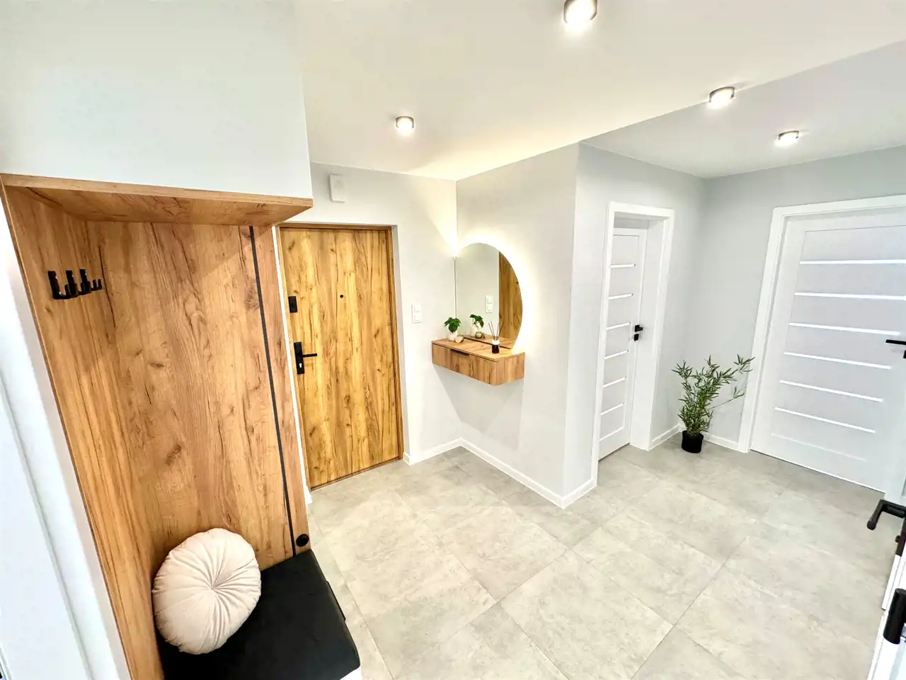 W mieszkaniu znajduje się duża, funkcjonalna, widna kuchnia, w której została wykonana wysokiej klasy zabudowa meblowa przez stolarza. Zainstalowano wszelkie niezbędne sprzęty AGD znanych marek tj: okap, piekarnik elektryczny, płyta indukcyjna, lodówko-zamrażarka oraz zmywarka. Łazienki w mieszkaniu zostały zaprojektowane w nowoczesnym stylu. Zainstalowano w niej wysokiej klasy armaturę oraz energooszczędne i modne oświetlenie LED, a także wstawiono pralkę. W przedpokoju znajduje się wysokiej klasy szafa z lustrem w zabudowie wykonana przez stolarza na wymiar. Do wykończenia mieszkania zostały użyte wysokogatunkowe materiały w nowoczesnym dizajnie: świetnej jakości farby w jasnych kolorach, panele o wysokiej klasie oraz energooszczędne i modne oświetlenie.