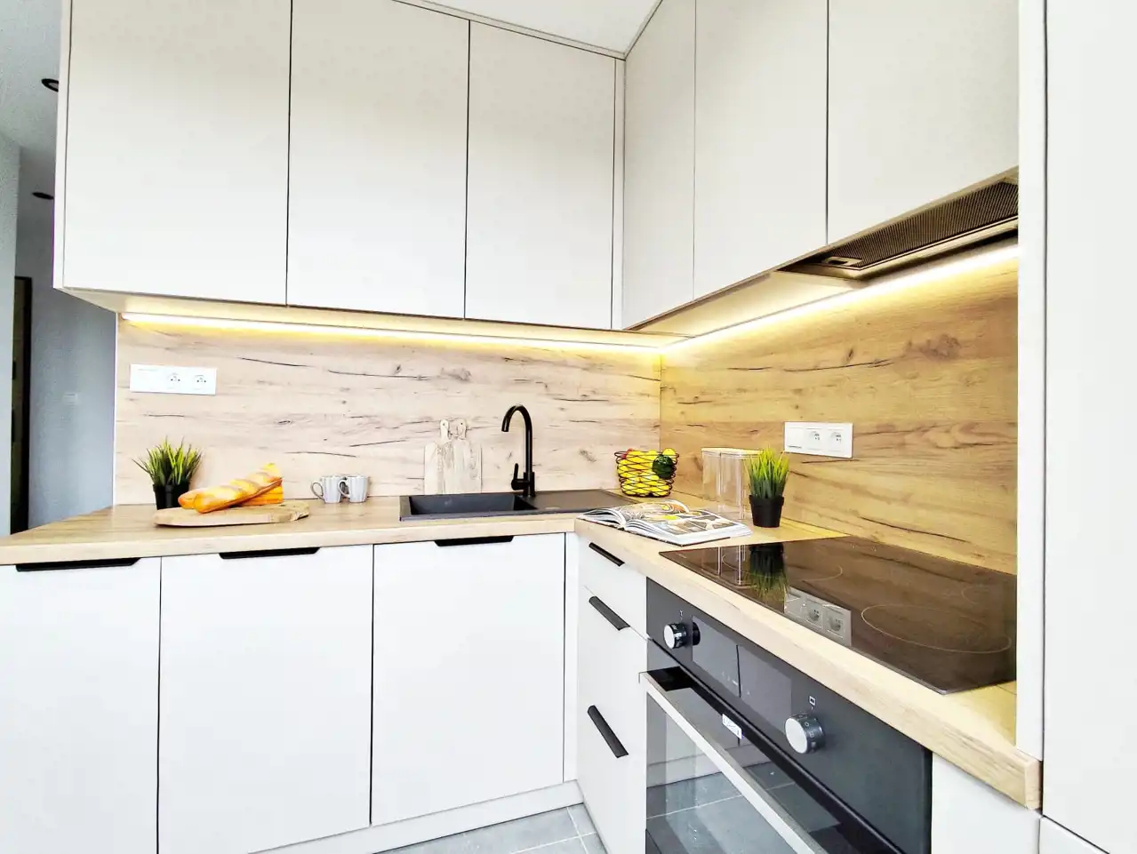 - wstawienie nowych sprzętów AGD (okap, piekarnik, płyta grzewcza, lodówka, zmywarka)