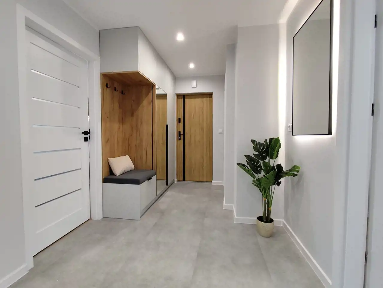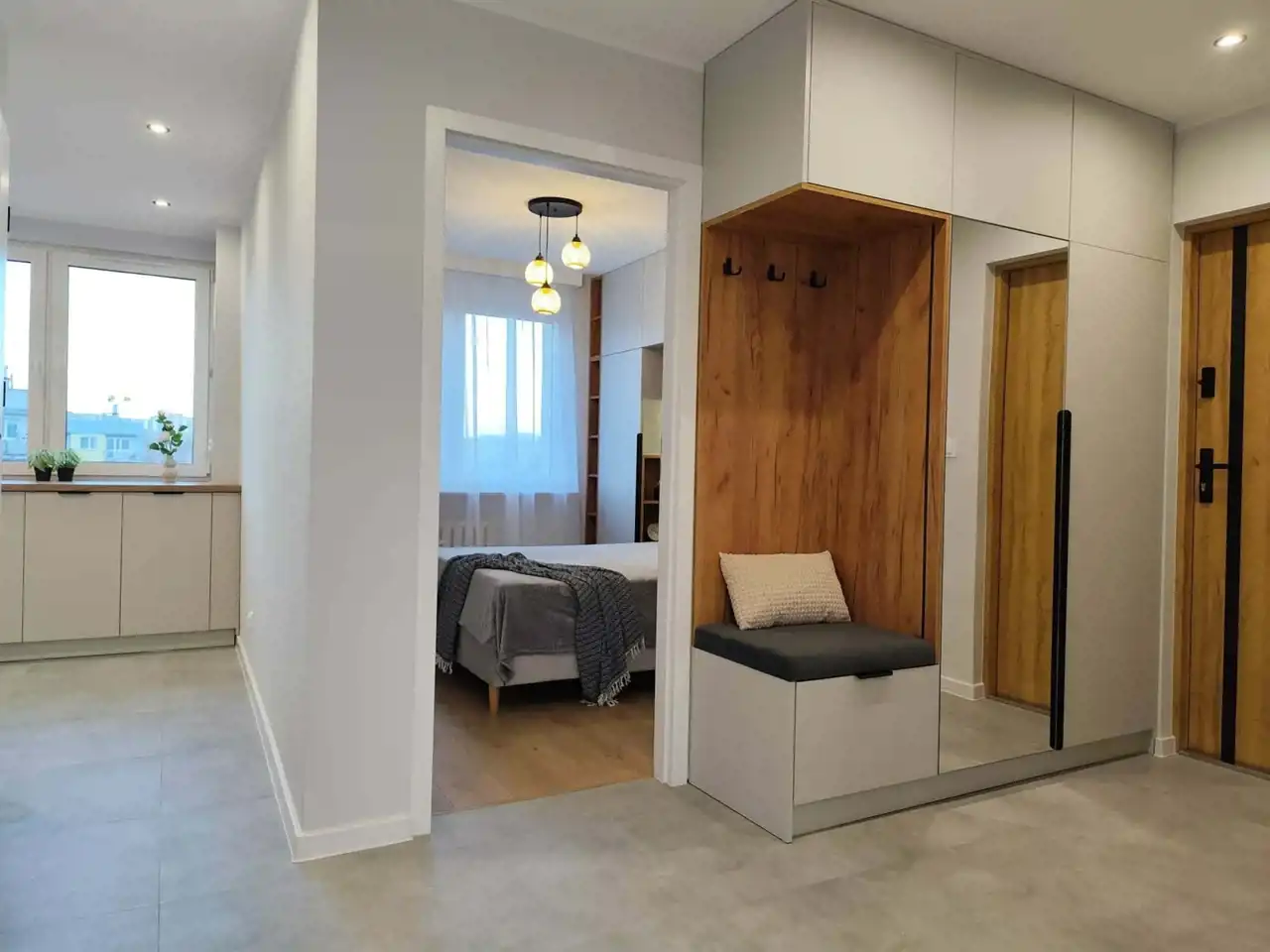 - wykonanie zabudowy meblowej na wymiar przez stolarza w kuchni, łazience, sypialni oraz przedpokoju