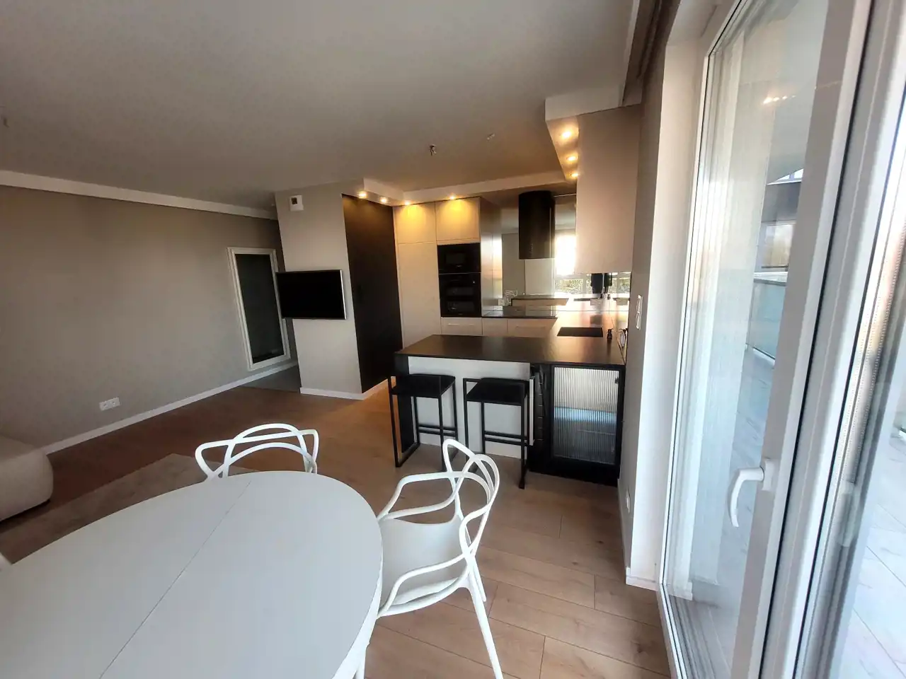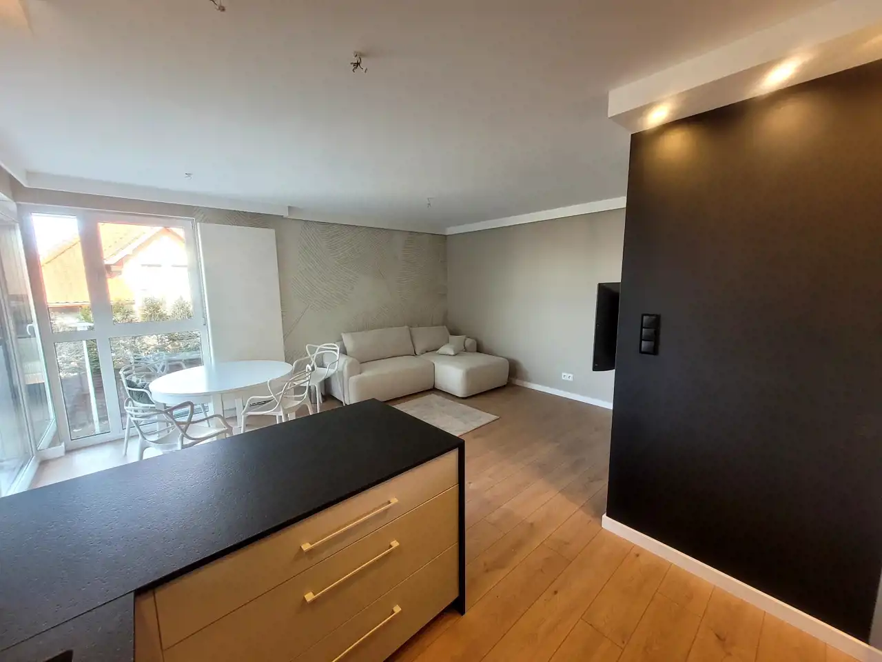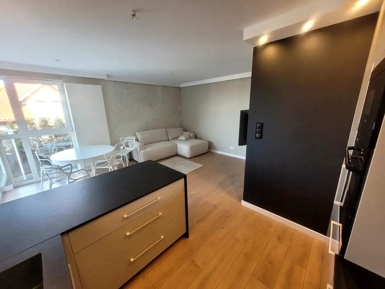 salon z aneksem kuchennym i wyjściem na taras