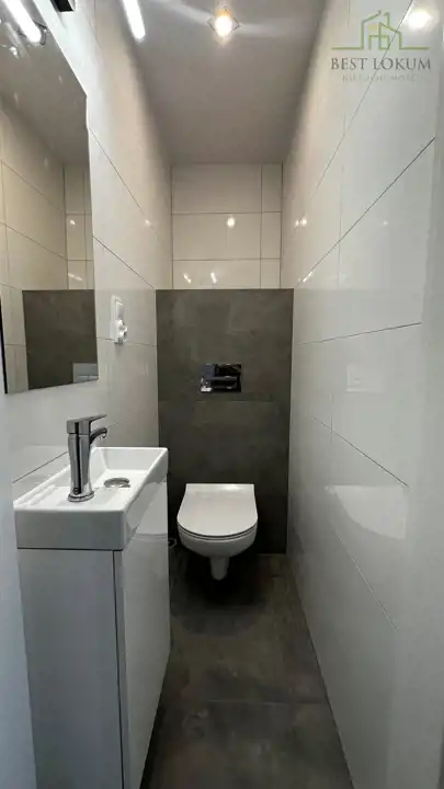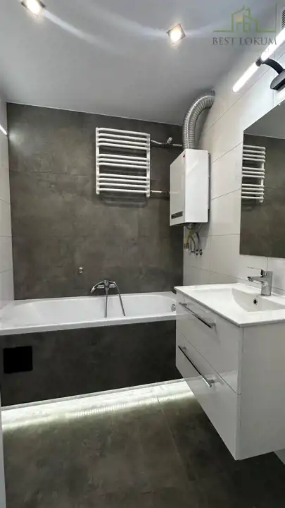 Nowoczesna łazienka z wanną, która spełni oczekiwania nawet najbardziej wymagających. Osobne wc wraz z umywalką.