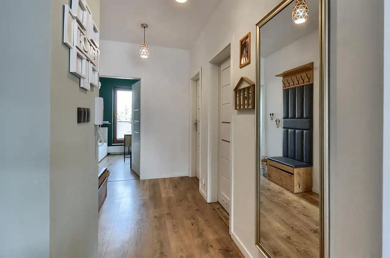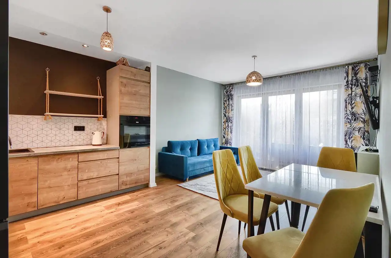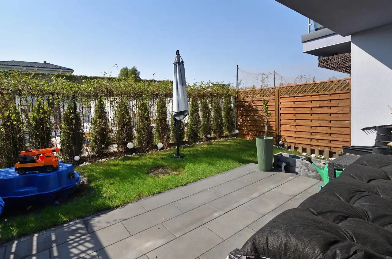 For sale: modern 3-room apartment with a large garden, located on the ground floor of a terraced house from 2021, situated in the Zagórze district of Kielce. The apartment has an area of 61.3 m², finished in a modern style, with a built-in kitchen fully equipped with household appliances (induction hob, dishwasher, oven, fridge-freezer, TV, washing machine) — ready to move in. Hot water and heating are provided by a dual-function gas boiler.