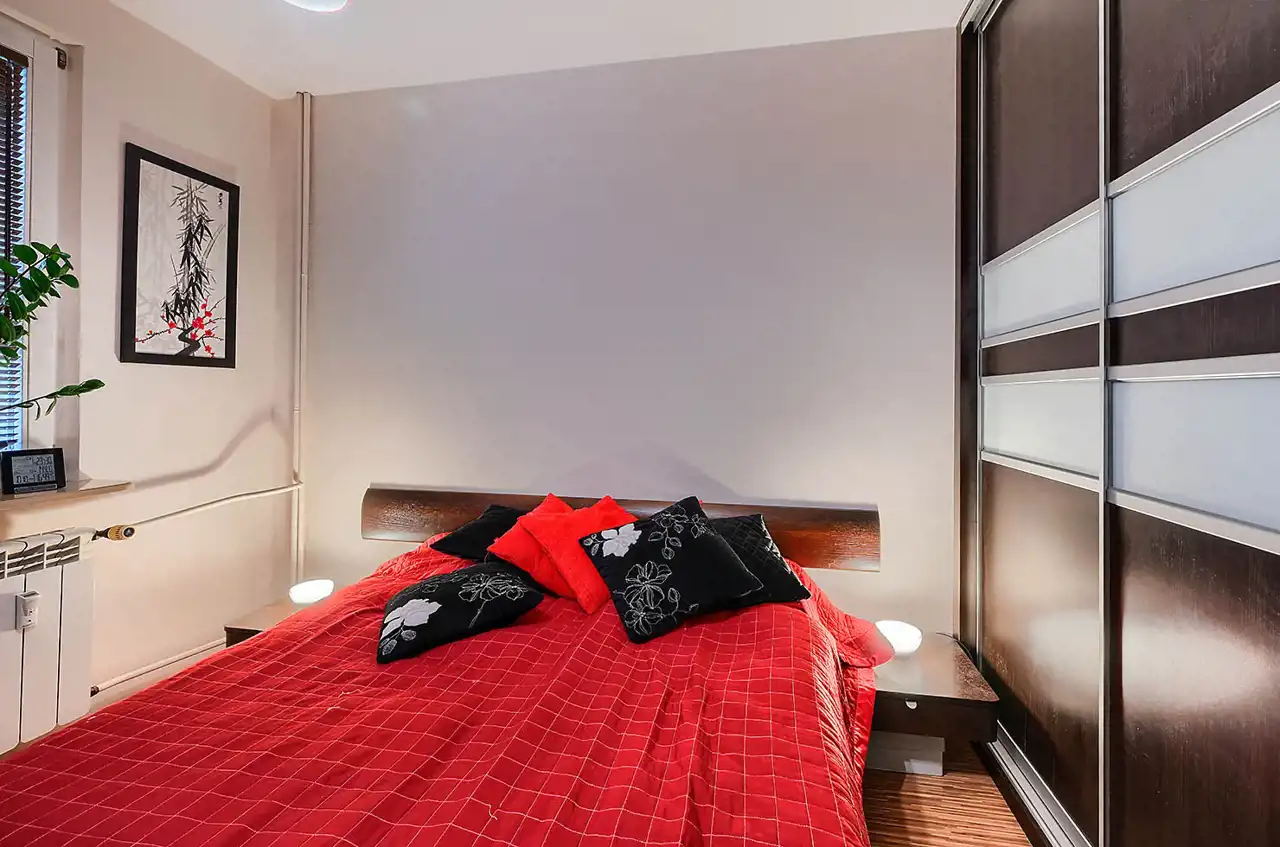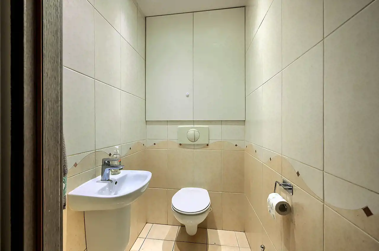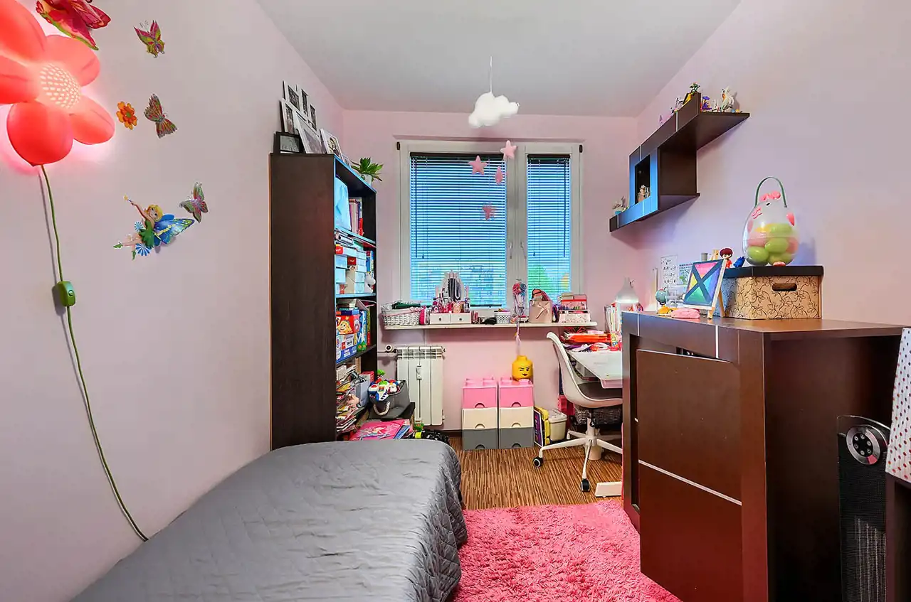 The apartment consists of four rooms (approx. 18.4, 9.4, 9.6, and 9.7 m²), a separate bright kitchen (approx. 9.6 m²), a bathroom (approx. 3.00 m²), a separate toilet (approx. 1.5 m²), and a hallway. The apartment has a functional layout, is dual-aspect and bright (east-west exposure). The kitchen is fitted with custom-built furniture. The floors in the rooms are finished with panels; the kitchen, hallway, and bathroom have stoneware tiles. Heating and hot water are supplied from the municipal network. The apartment features a spacious balcony. The owner has access to a basement storage room.