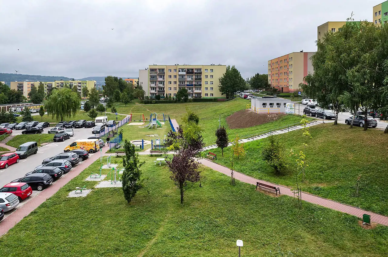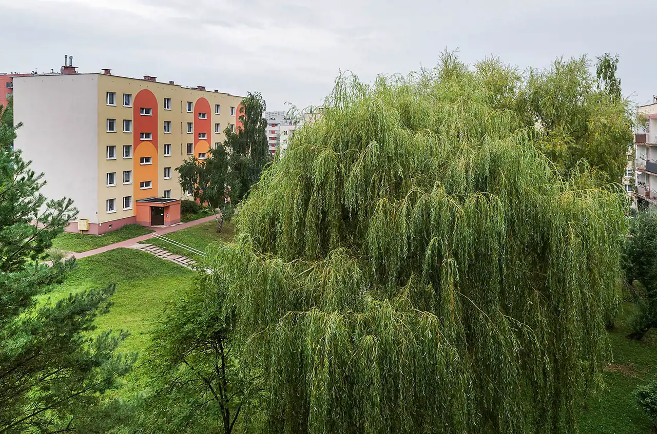 Blok z wygodną, obszerną, czystą klatką schodową, estetyczny, po termomodernizacji, teren w sąsiedztwie bloku zadbany, zagospodarowany.