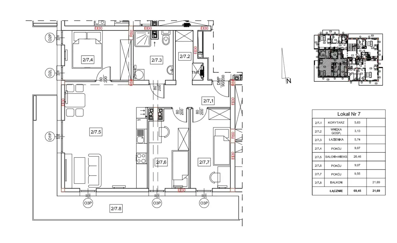 - Charakterystyka mieszkania 69.45 m2, 4 pokoje