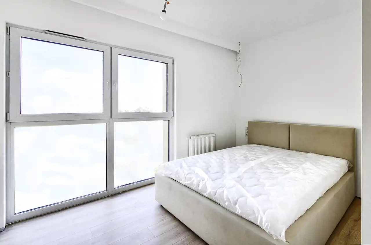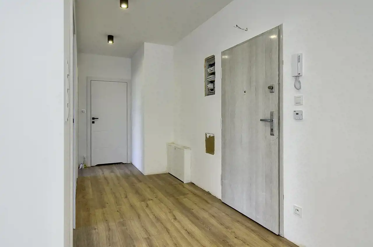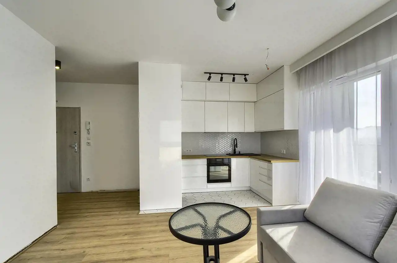 The apartment has an area of 59.45 m² and is aesthetically finished, with a modern kitchen fitted with high-quality household appliances from Electrolux and Samsung (induction hob, dishwasher, oven, fridge-freezer). All appliances are new, unused, and under warranty.