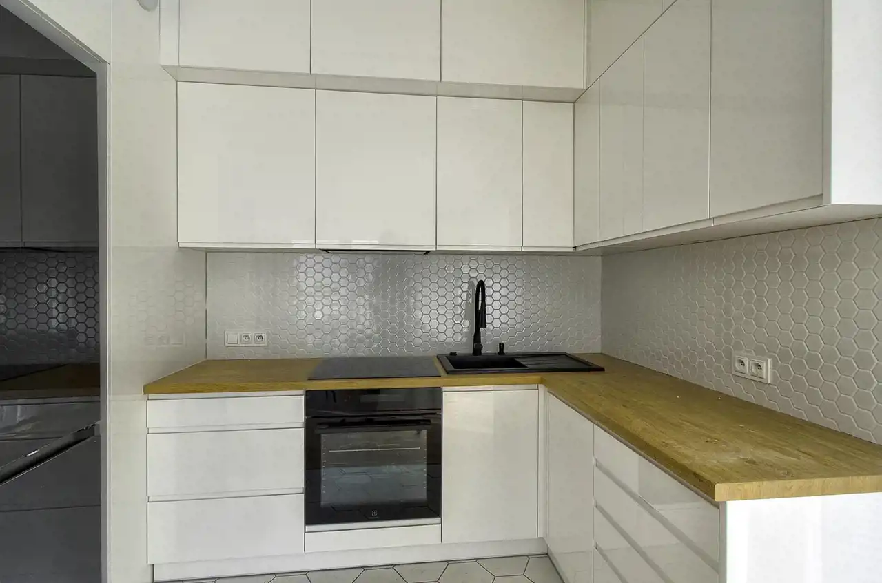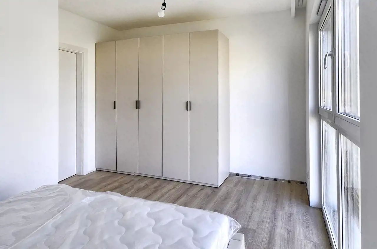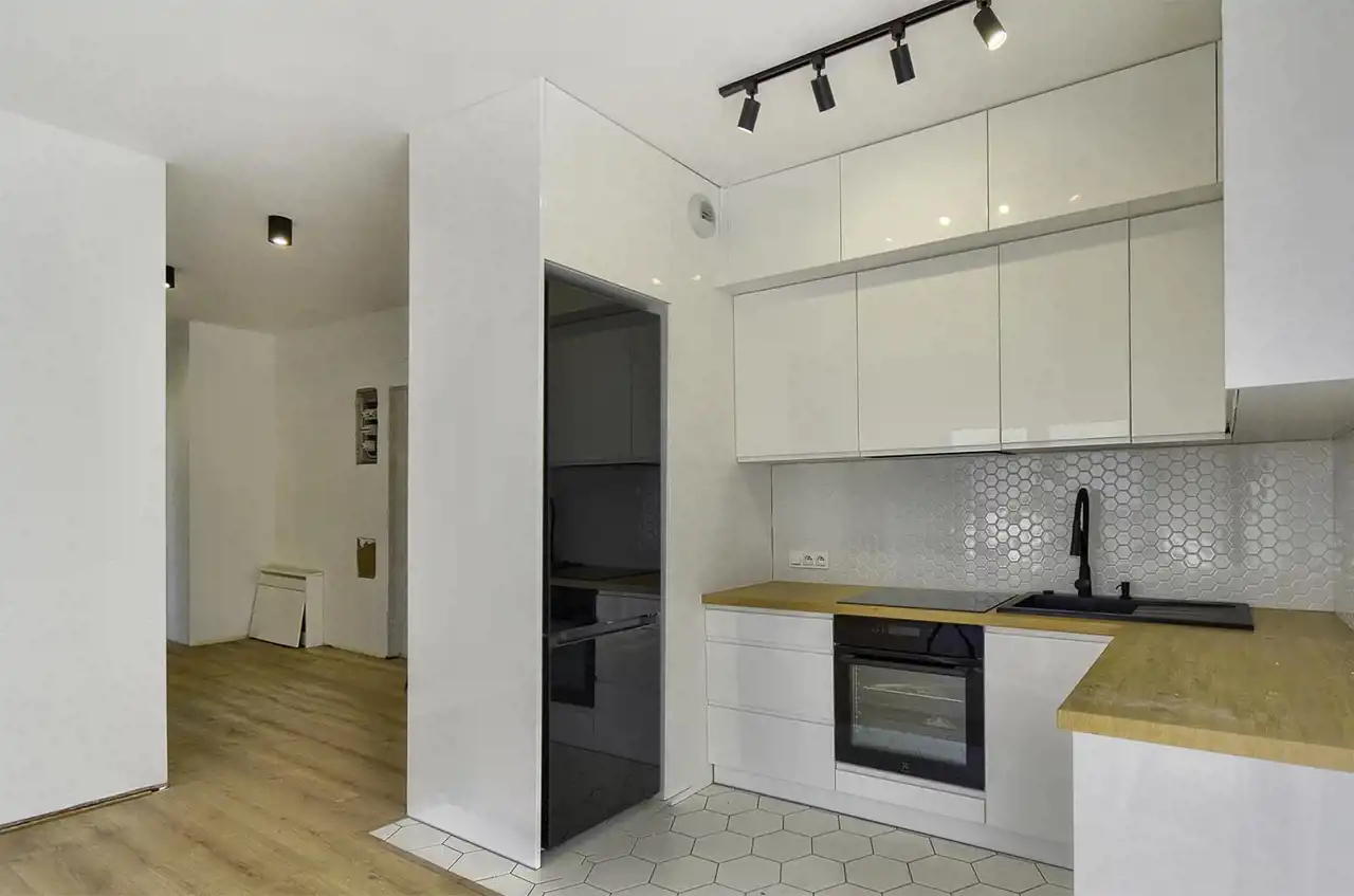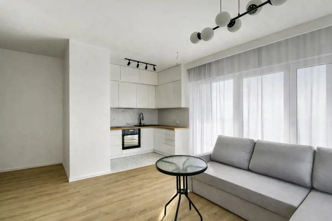 The apartment has an area of 59.45 m² and is aesthetically finished, with a modern kitchen fitted with high-quality household appliances from Electrolux and Samsung (induction hob, dishwasher, oven, fridge-freezer). All appliances are new, unused, and under warranty.