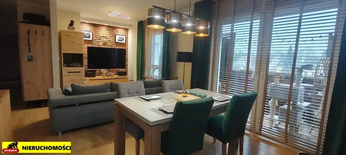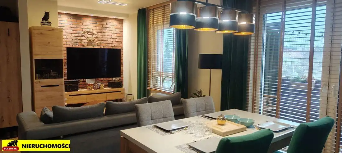 Kuchnia to duża, otwarta przestrzeń. Nad częścią kuchenną podwieszany sufit z podświetleniem LED oraz punktowym (niezależne od siebie). Blat kuchenny zakończony niewielką "półwyspą" mogącą służyć np. za dodatkową część roboczą lub bufet. Kuchnia w pełni wyposażona w sprzęt AGD ( lodówka, zmywarka, płyta indykcyjna, piekarnik elektryczy, okap- wszystkie sprzęty wysokiej jakości), wygodna i funkcjonalna, stylowa część jadalniana z miejscem na duży rozkładany stół, umiejscowiona przy dużym, podwójnym oknie balkonowym (ruchomy słupek, możliwość otwarcia obu skrzydeł). Strefa wypoczynkowa z efektowną i przytulną ścianą z prawdziwej cegły. W ścianie ukryty tunel ułatwia utrzymanie porządku. Całe pomieszczenie jest klimatyzowane(klimatyzacja z funkcją ogrzewania)