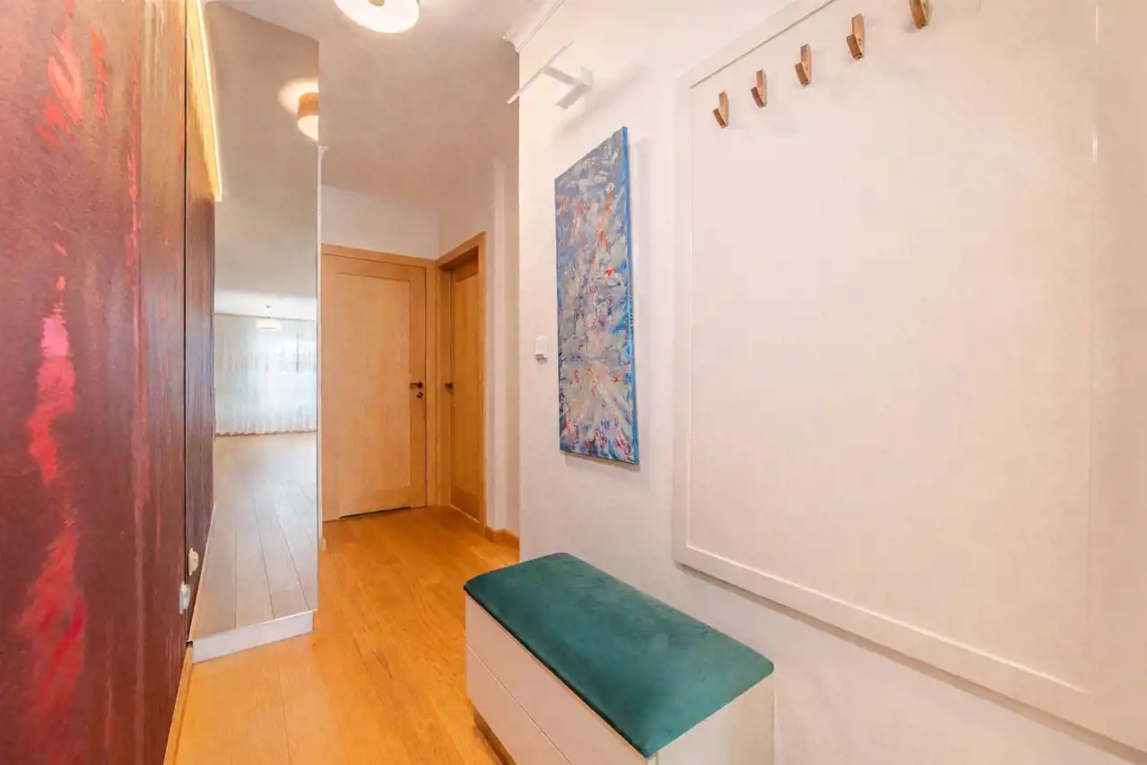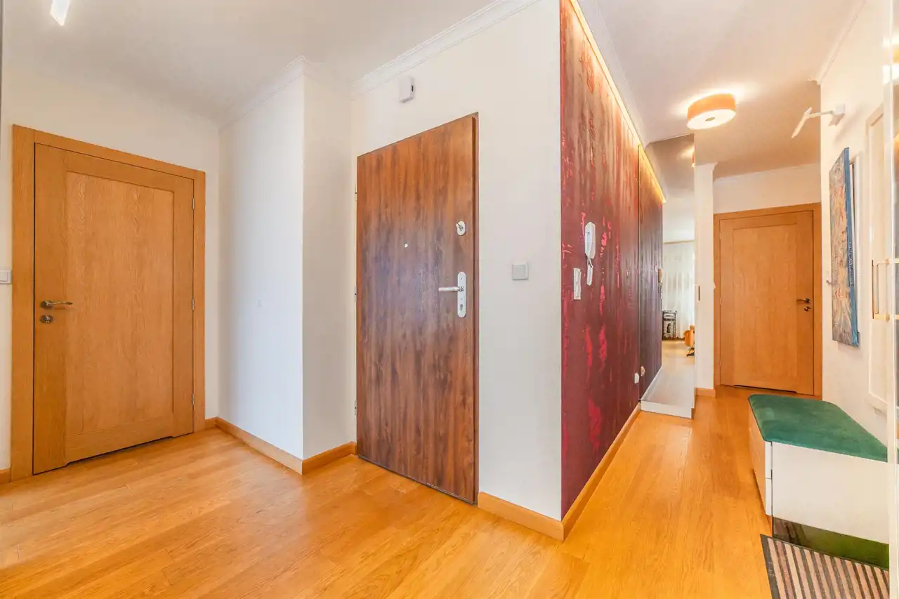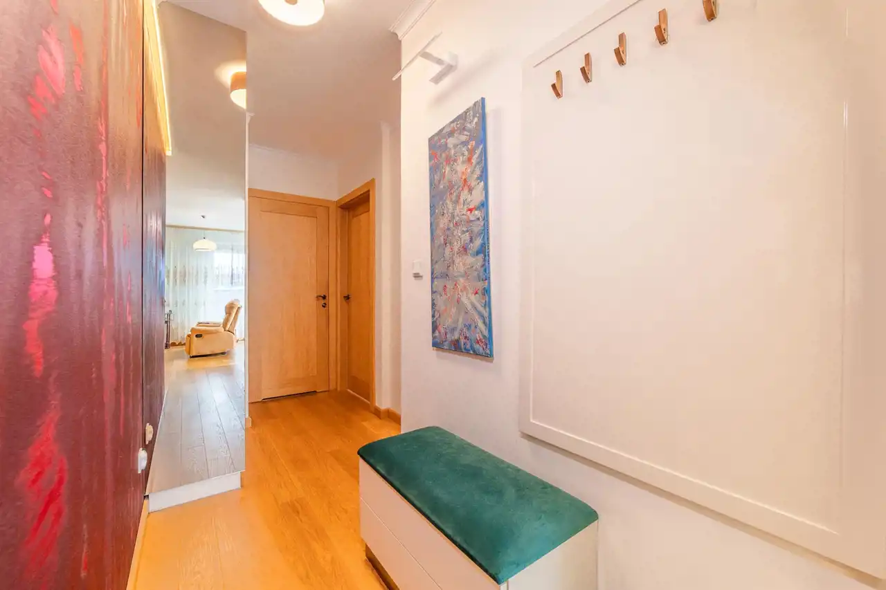 Oak wooden flooring throughout the apartment.