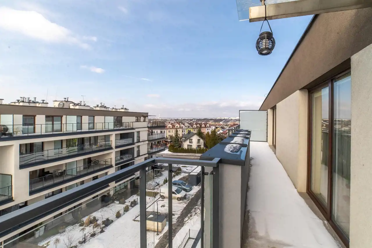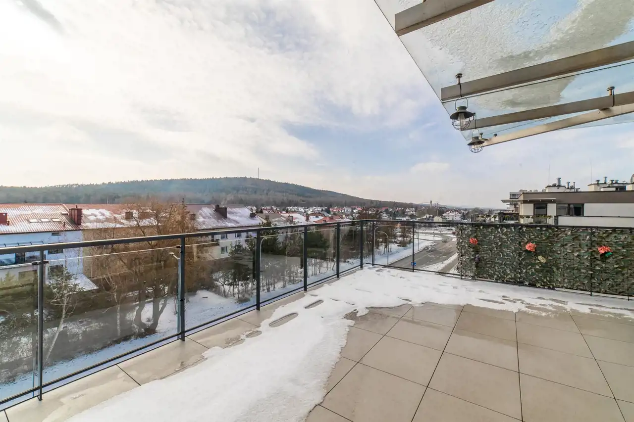 a living room connected with a kitchenette, fully equipped with high-quality household appliances (TV, oven, dishwasher, refrigerator, induction hob). The living room provides access to a large terrace of 58.38 m² with a panoramic view of Kielce.