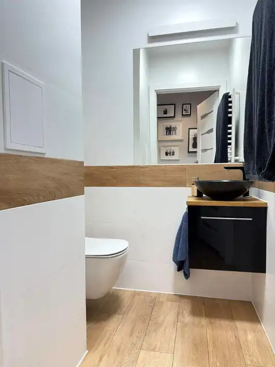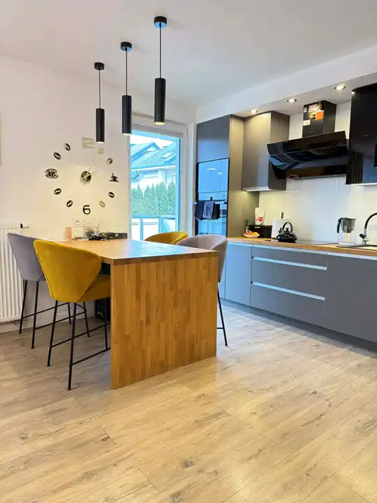 Na podłogach zastosowano wysokiej jakości panele winylowe, a całość utrzymana jest w nowoczesnej, spójnej stylistyce. Duże przeszklenia zapewniają doskonałe doświetlenie wnętrz i poczucie przestrzeni.