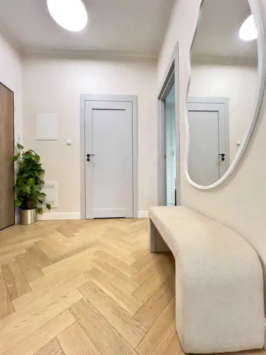 - Lite drewno dębowe — podłoga, która świadczy o klasie i stylu. W tym apartamencie zastosowano podłogi z litego drewna - dębu, ułożone w ponadczasową, klasyczną jodełkę. To rozwiązanie, które nie tylko zachwyca wyglądem, ale przede wszystkim: Korzyści, które otrzymuje Kupujący: trwałość na lata – lite drewno to jeden z najbardziej odpornych i szlachetnych materiałów na rynku. Nie zużywa się tak jak panele czy deski warstwowe. Możliwość wielokrotnej renowacji – takiej podłogi nie wymienia się na nową, tylko odnawia. To ogromna oszczędność i podniesienie wartości nieruchomości. Naturalne ciepło pod stopami – drewno daje przyjemne uczucie ciepła i komfortu, którego nie da żaden syntetyczny materiał. Prestiż i elegancja – jodełka z litego dębu to wzór kojarzony z luksusowymi kamienicami, rezydencjami i apartamentami premium. Unikalność – każda deska ma swój indywidualny rysunek słojów. W efekcie podłoga jest jak dzieło sztuki stworzone przez naturę. To detal, który od progu mówi: jakość, klasa i ponadczasowy styl.