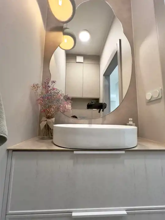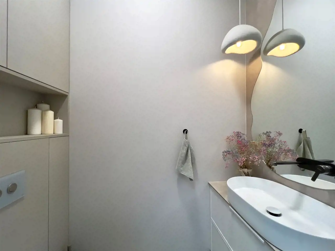 - Standard Premium – jakość, którą czuć na każdym kroku. Wnętrze zaprojektowane zostało w ciepłych, jasnych barwach, które tworzą atmosferę elegancji i harmonii. Wszystkie meble wykonane zostały na zamówienie z wysokiej jakości płyt akrylowych w satynowym lakierze — to efekt, który zdecydowanie wyróżnia ten apartament na rynku.