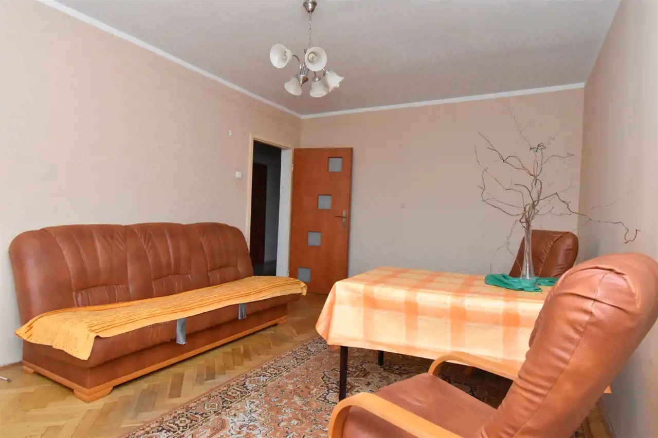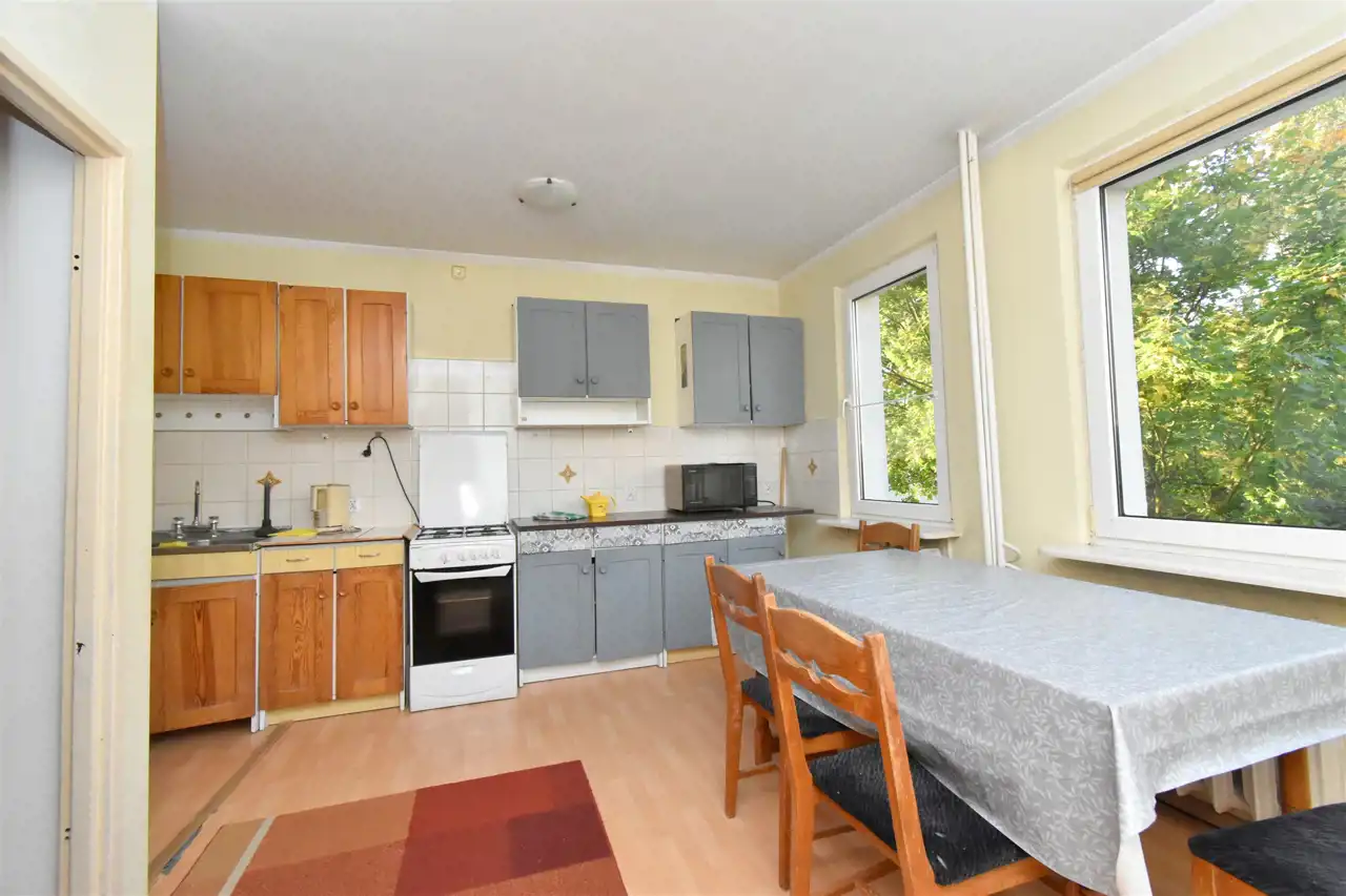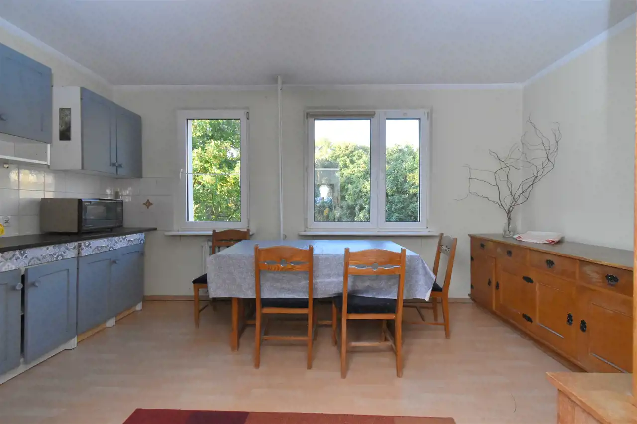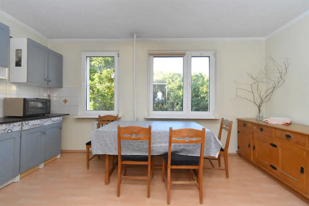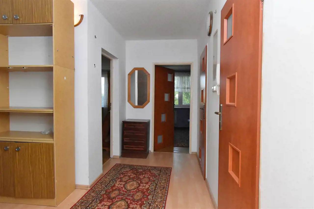 Na powierzchni 57 m2 znajduje się: dwa oddzielne pokoje, w tym jeden z balkonem, widna kuchnia połączona z jadalnią, duży przedpokój, łazienka oraz osobne WC. Brak piecyka gazowego.
