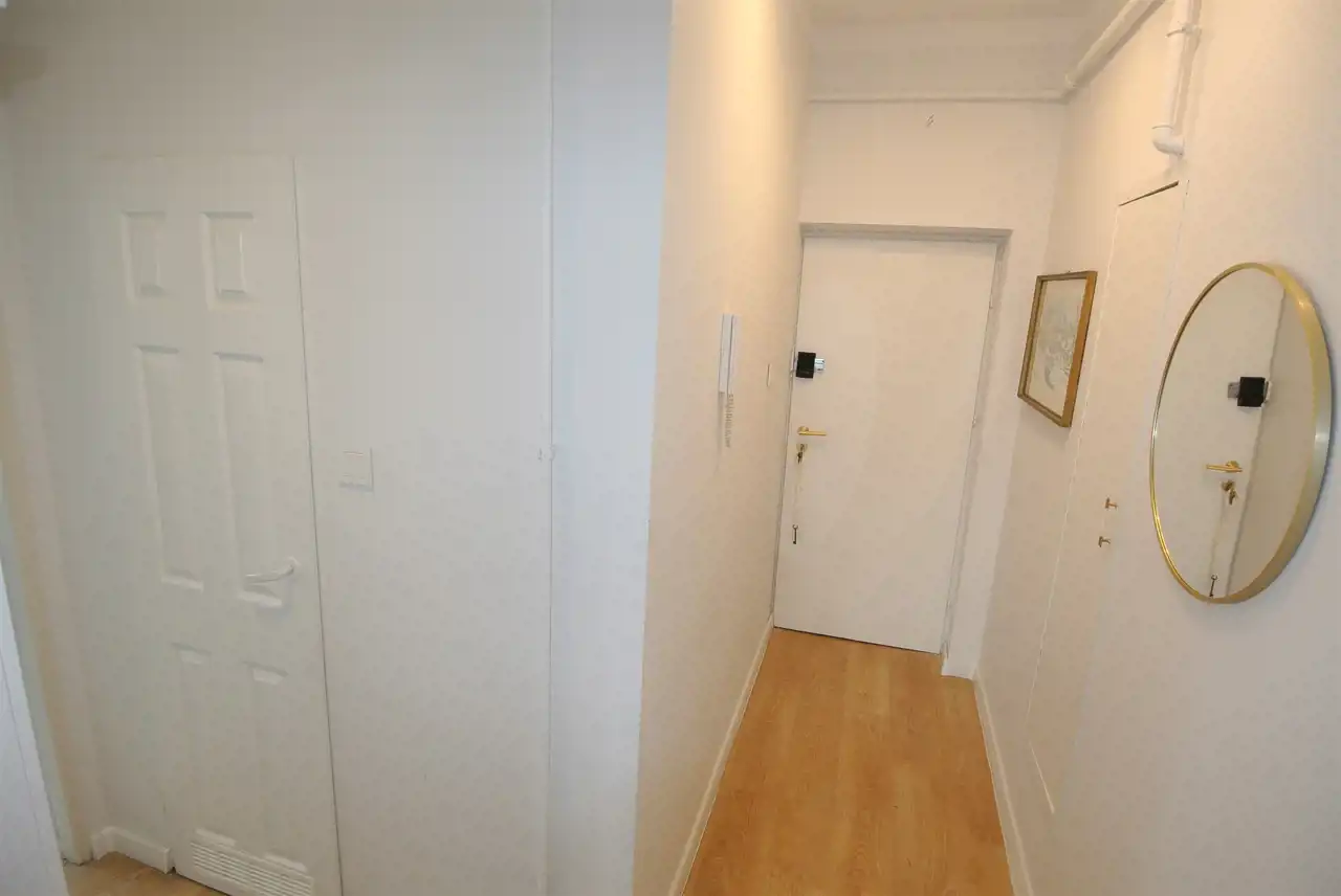Flooring: parquet in the room, tiles in the kitchen and bathroom, panels in the hallway.