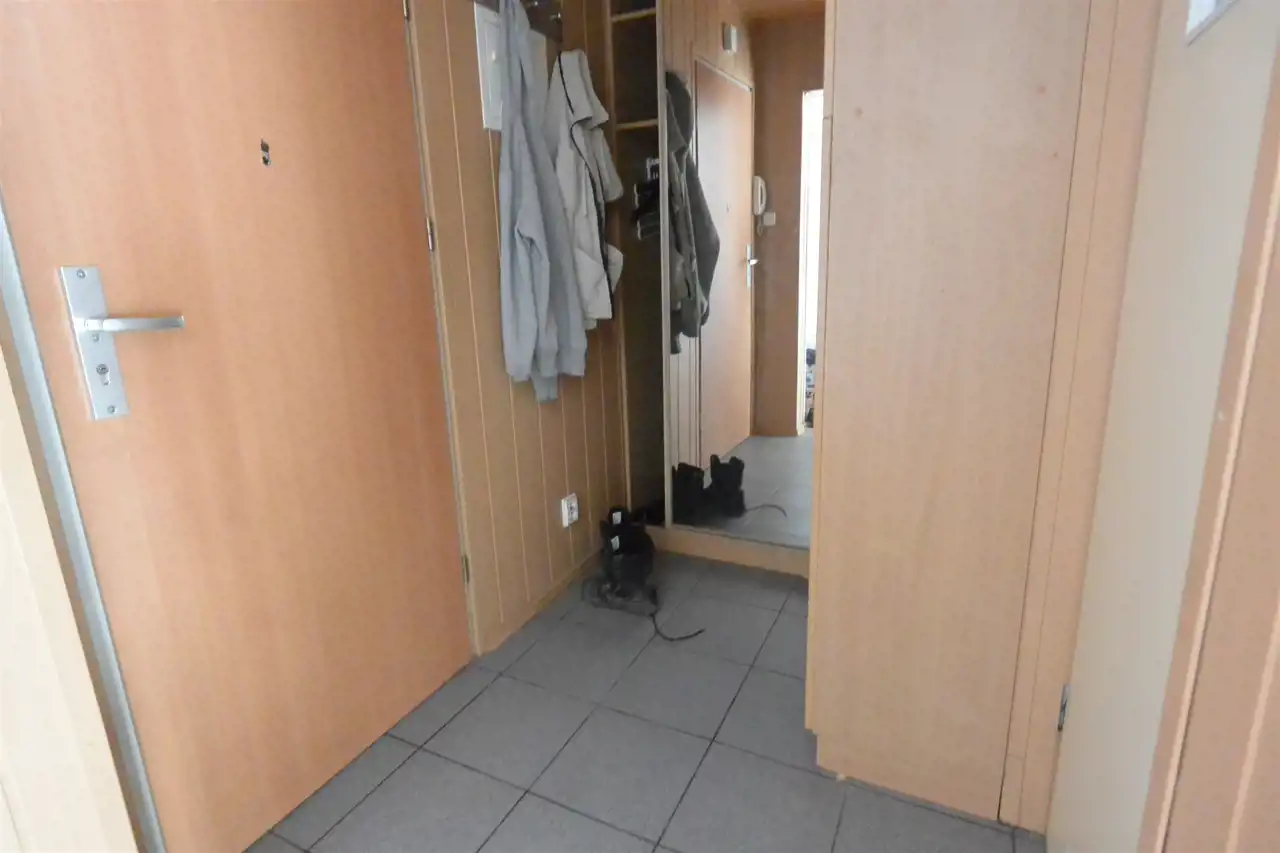 The apartment is single-aspect with southern exposure, partially furnished (with the possibility of additional furnishing). The building is gated, with a private parking area secured by a remote-controlled gate. The apartment is equipped with household appliances, including a new refrigerator, fiber-optic internet connection, and external anti-burglary shutters. The living room provides access to a large balcony, and there is a built-in wardrobe in the hallway.