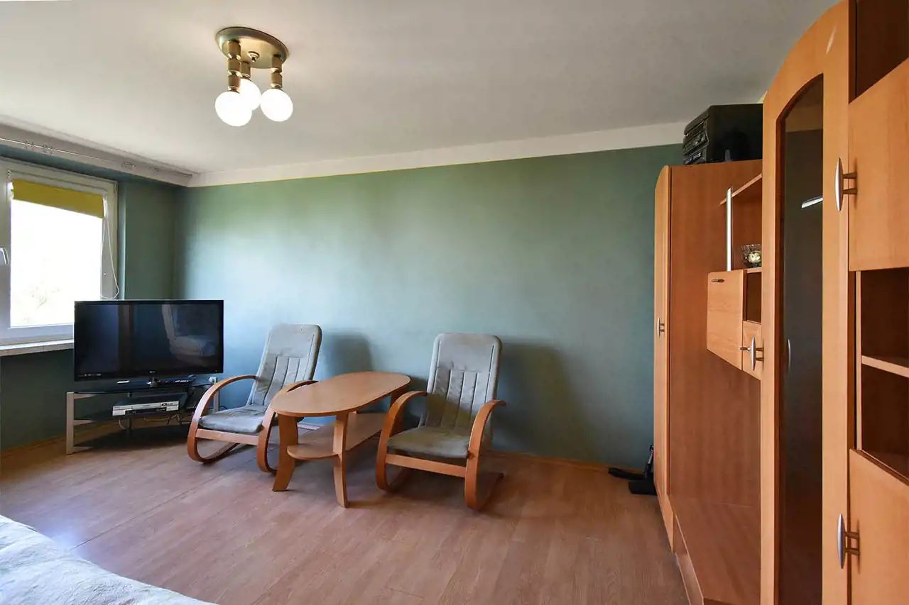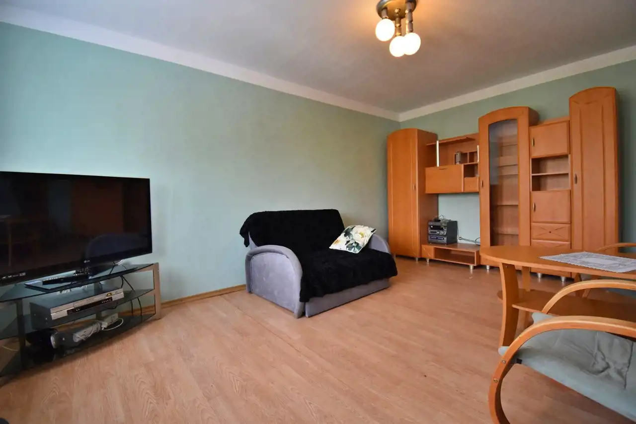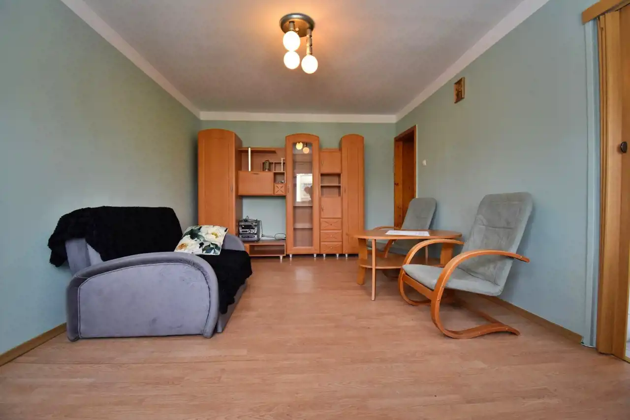 District heating, hot water from a gas water heater. The apartment is single-sided, bright, with a north-west exposure. PVC windows. Flooring: laminate in the living room, tiles in the bathroom, kitchenette, and hallway.