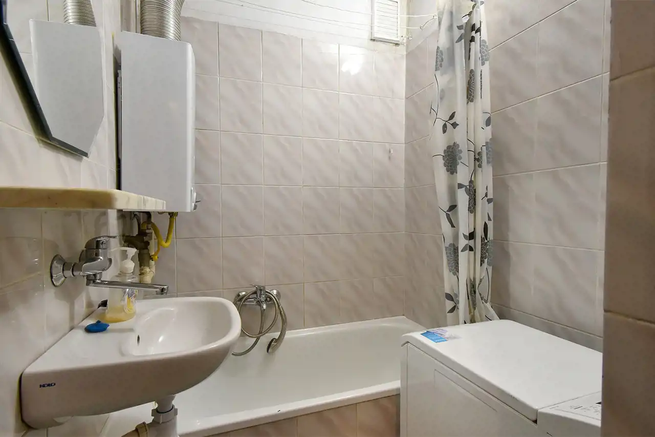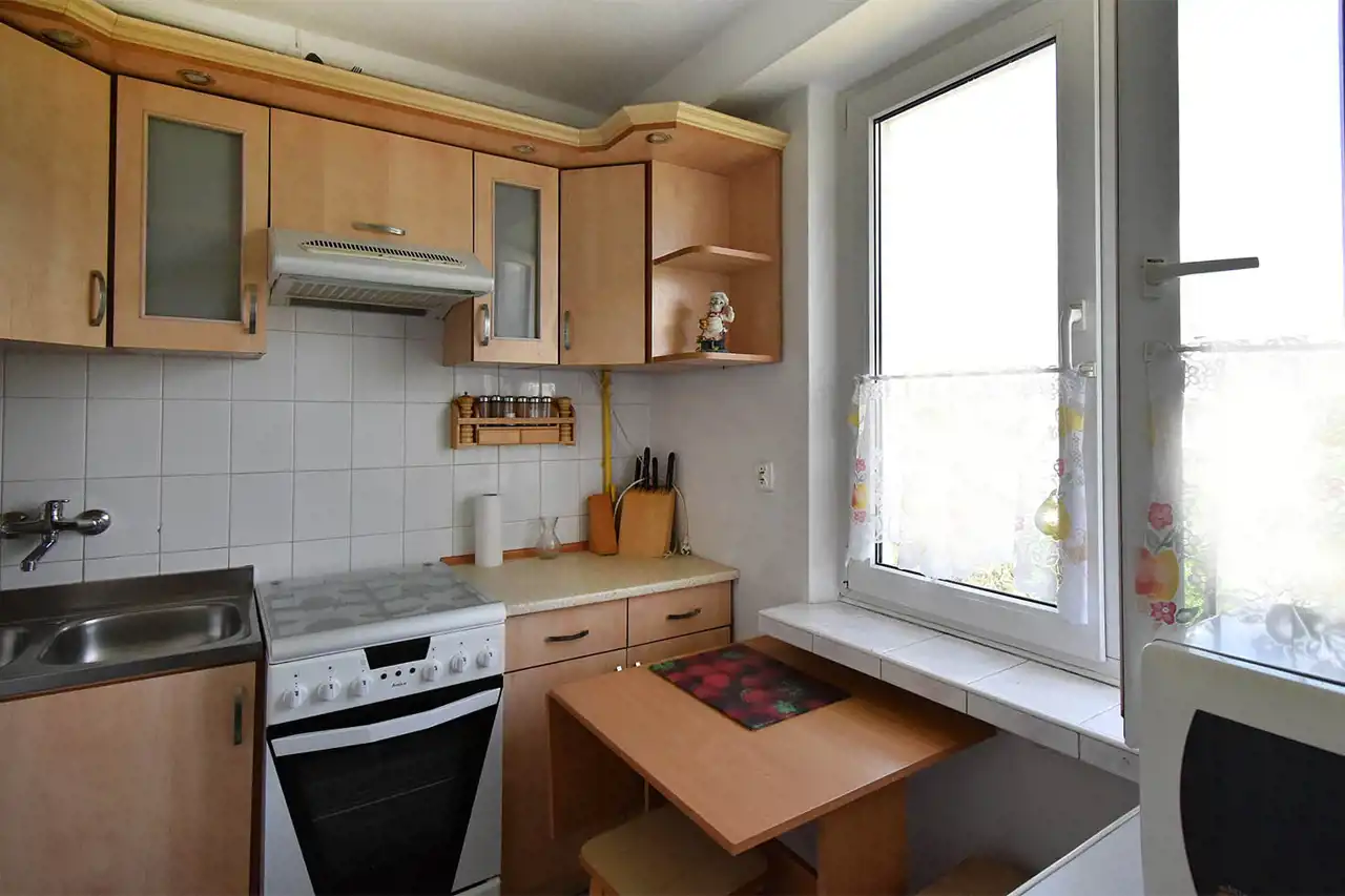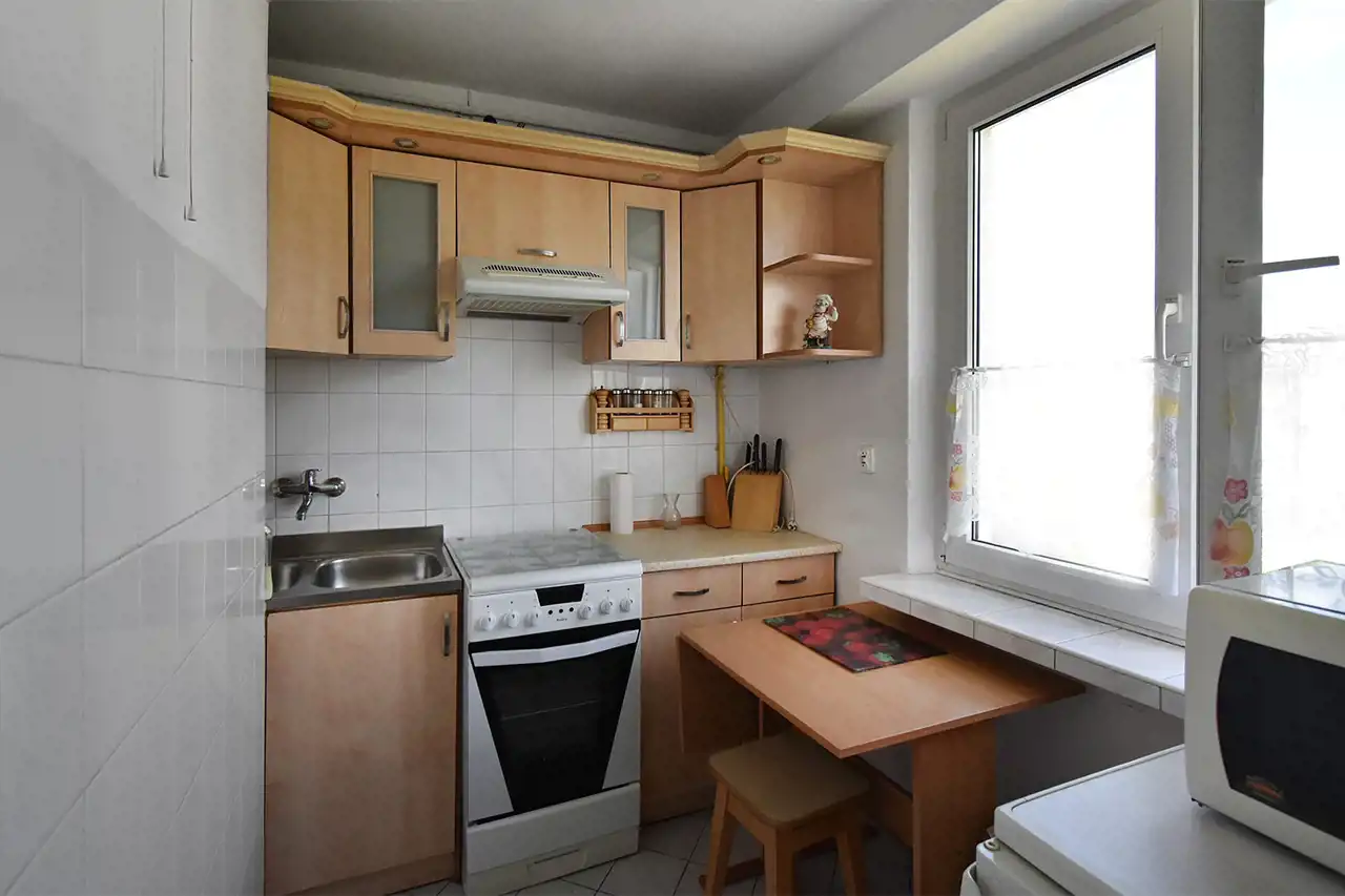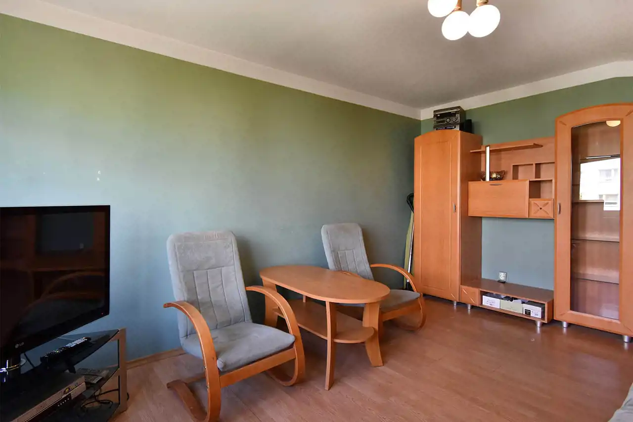 District heating, hot water from a gas water heater. The apartment is single-sided, bright, with a north-west exposure. PVC windows. Flooring: laminate in the living room, tiles in the bathroom, kitchenette, and hallway.