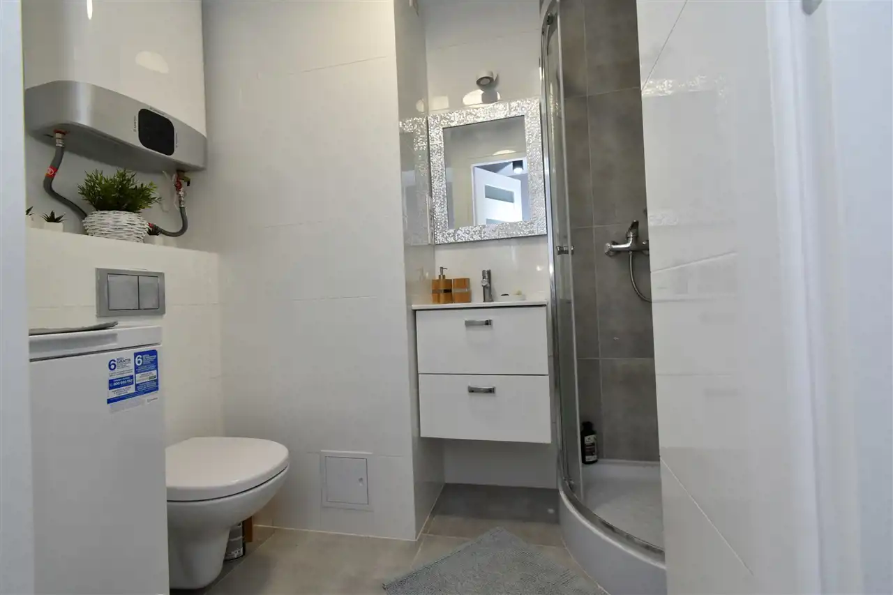 - łazienki z kabiną prysznicową i WC (umywalka, lustro, zabudowa, pralka),