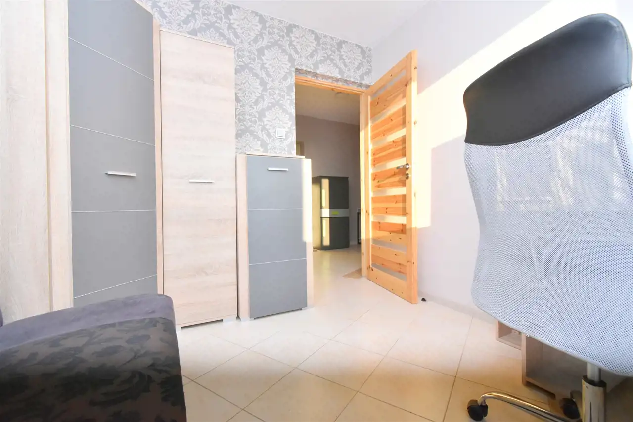 Całkowita powierzchnia lokalu mieszkalnego to 33,70 m2, na którą składa się: dwa oddzielne pokoje, widna kuchnia, łazienka z WC. W pokojach na podłodze położone panele, w kuchni, łazience i przedpokoju terakota. Na ścianach glazura.