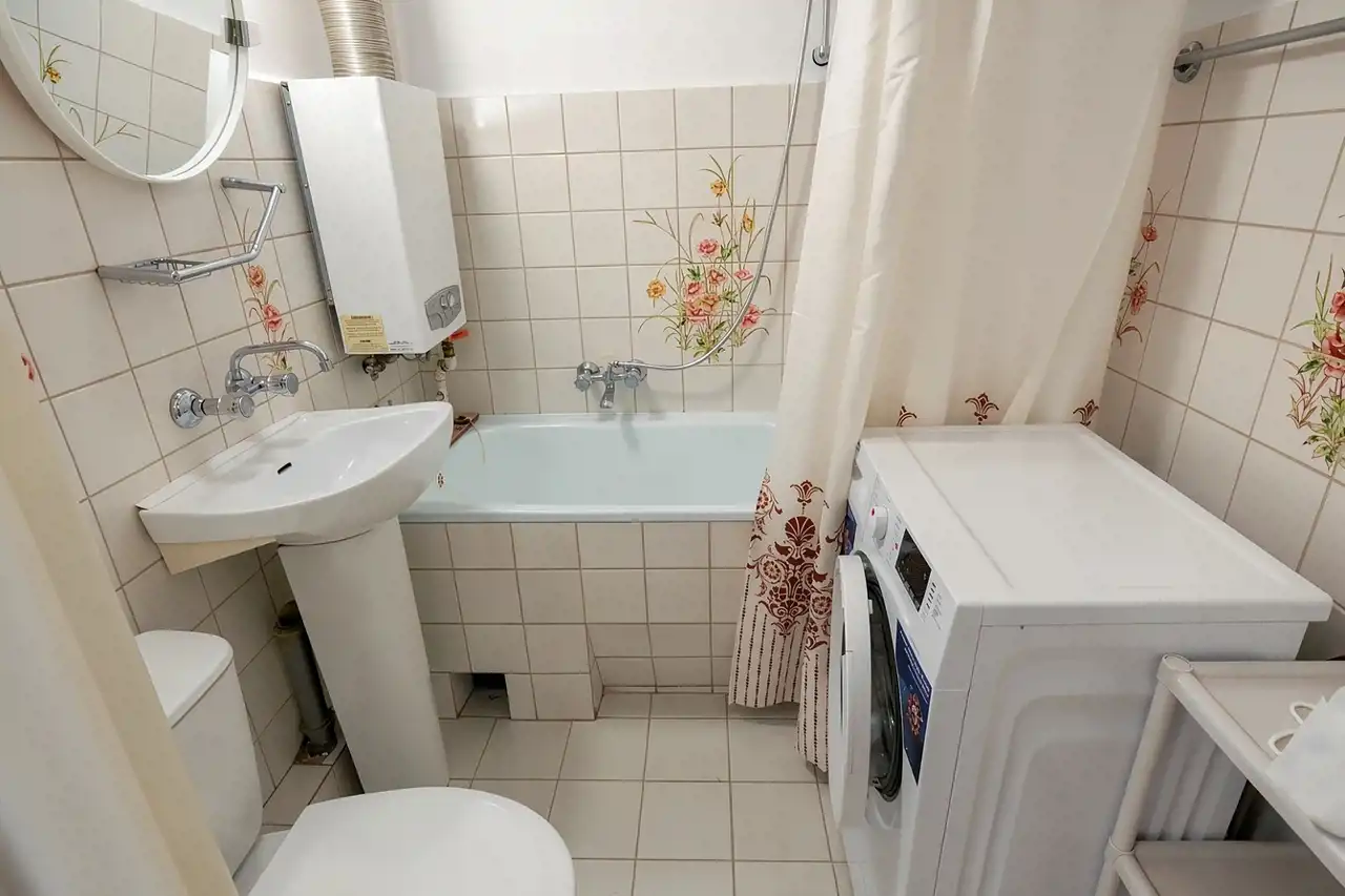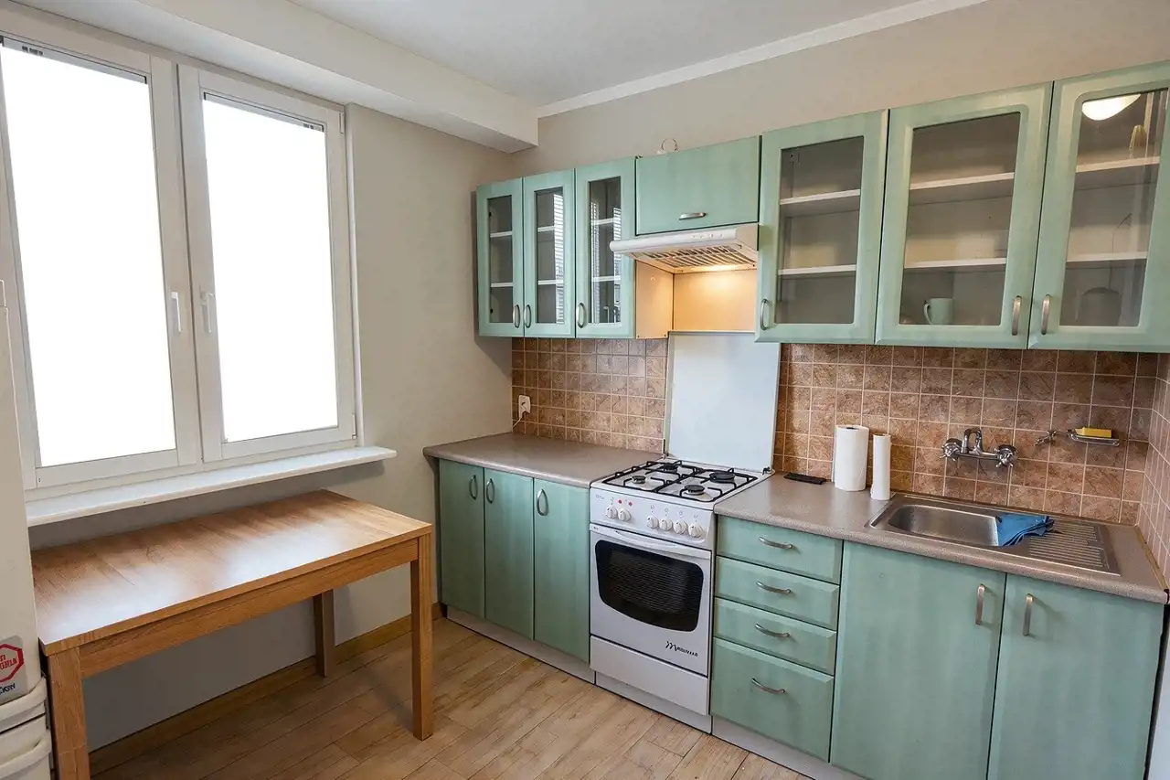The apartment is dual-aspect, with a balcony. Flooring: laminate panels. The apartment is partially furnished and equipped with basic household appliances (fridge-freezer, gas stove, extractor hood). Hot water is provided by a gas heater.