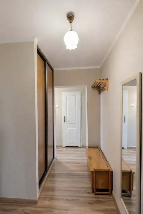 Mieszkanie dwustronne, z balkonem. Na podłogach panele. Mieszkanie jest częściowo umeblowane i wyposażone w podstawowy sprzęt AGD (chłodziarko-zamrażarka, kuchenka gazowa, okap). Ciepła woda ogrzewana za pomocą piecyka gazowego.