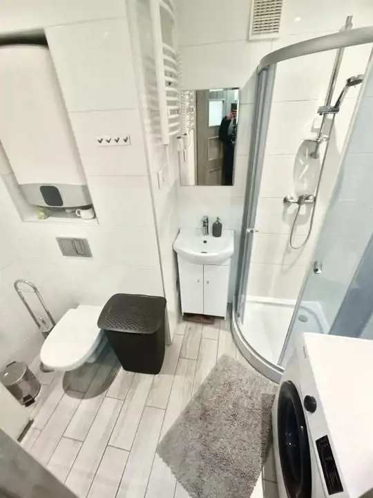 - łazienka z WC wyposażona w pralkę i szafki do przechowywania