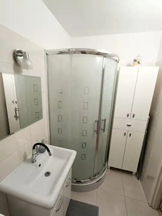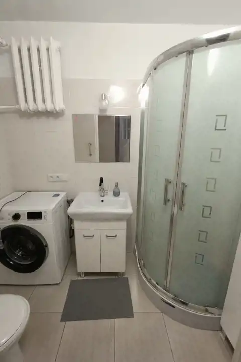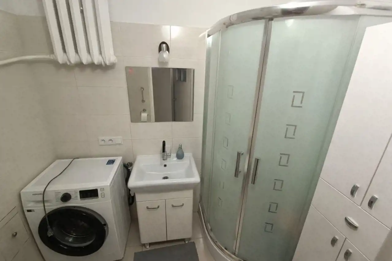 - łazienka z WC (pralka, szafki do przechowywania, prysznic, lustro)