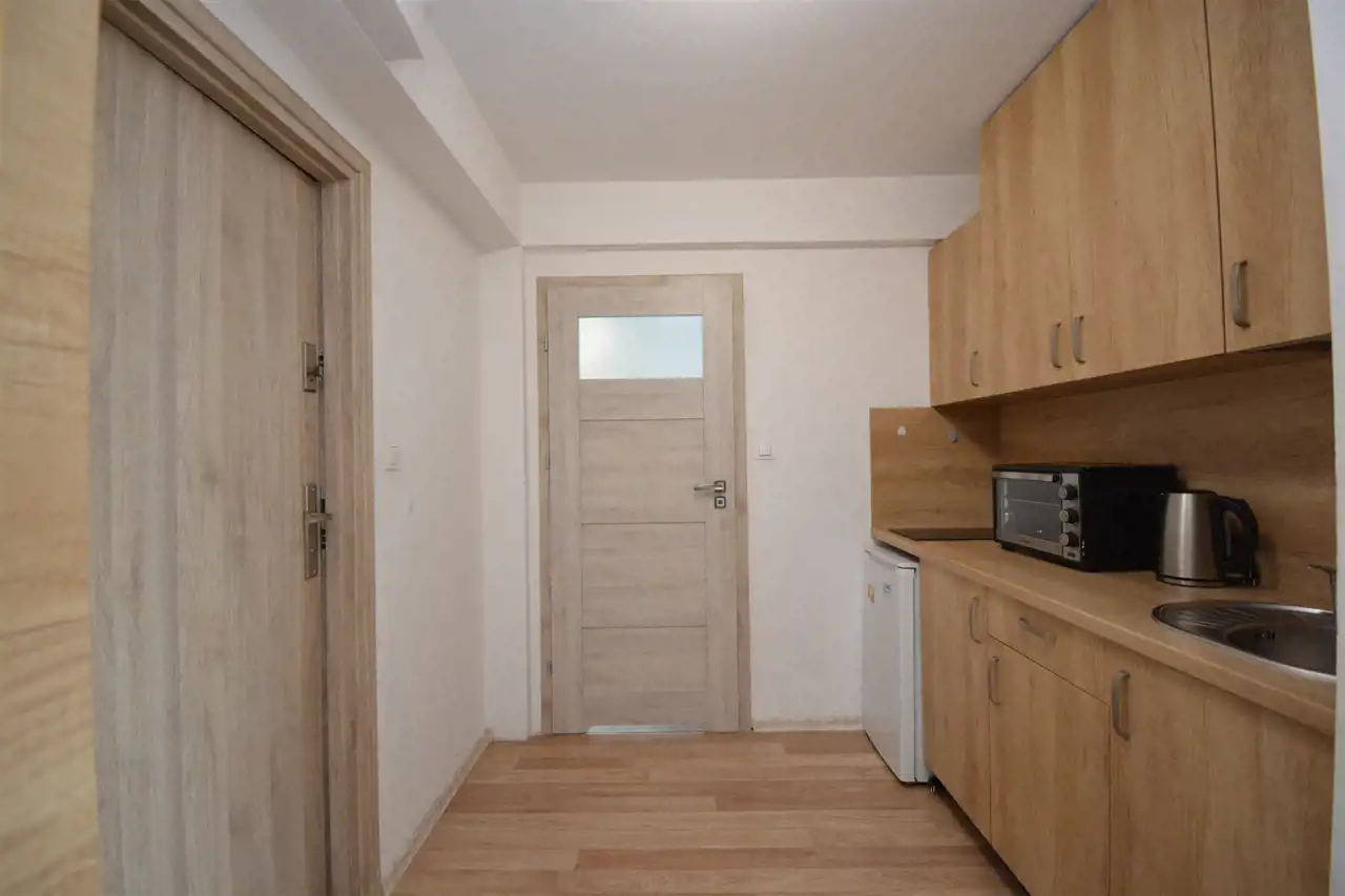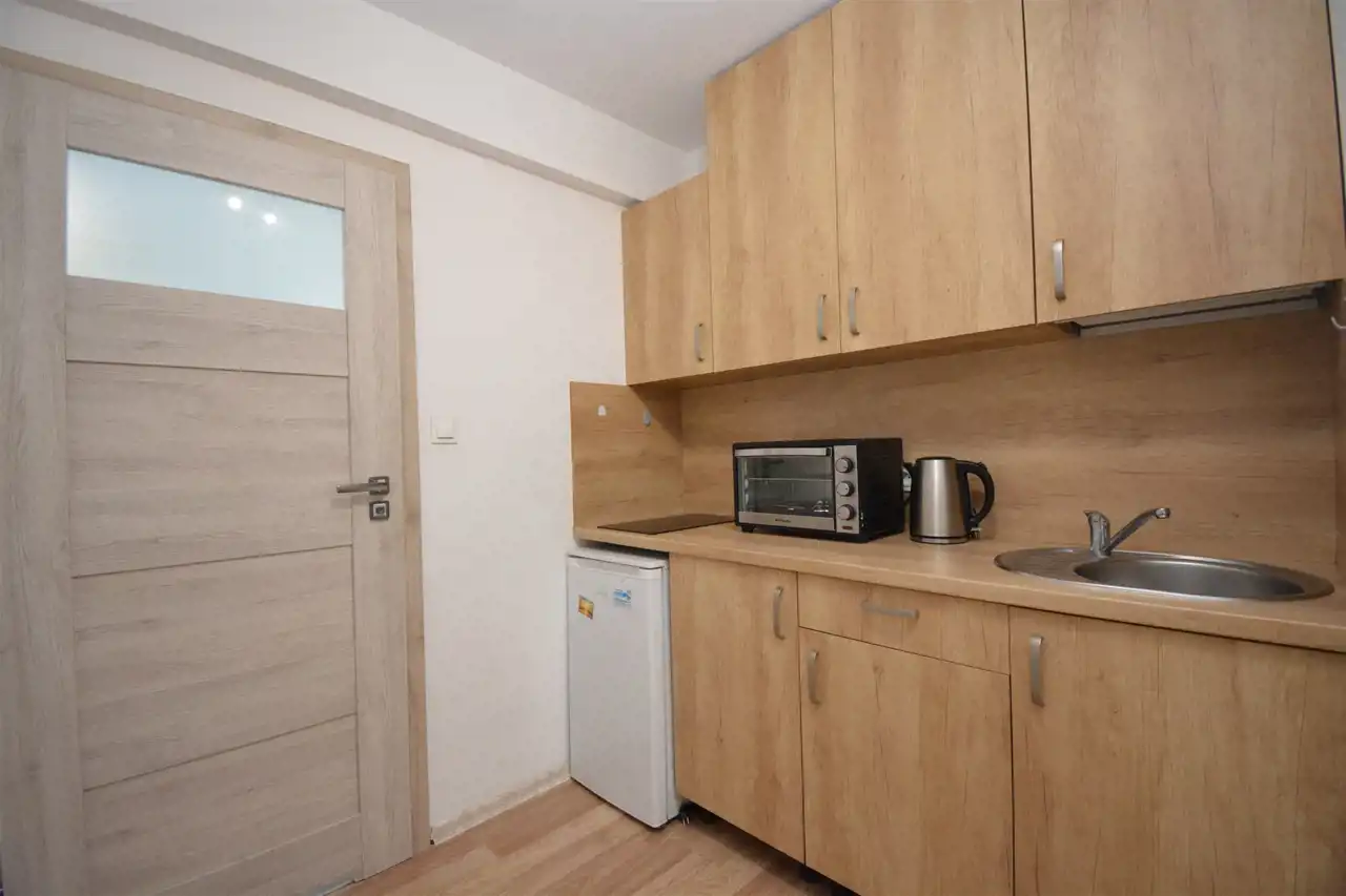 Aneks kuchenny wyposażony jest w zabudowę szafkową, płytą elektryczną do gotowania i podręczną lodówkę, czajnik oraz mikrofalę.