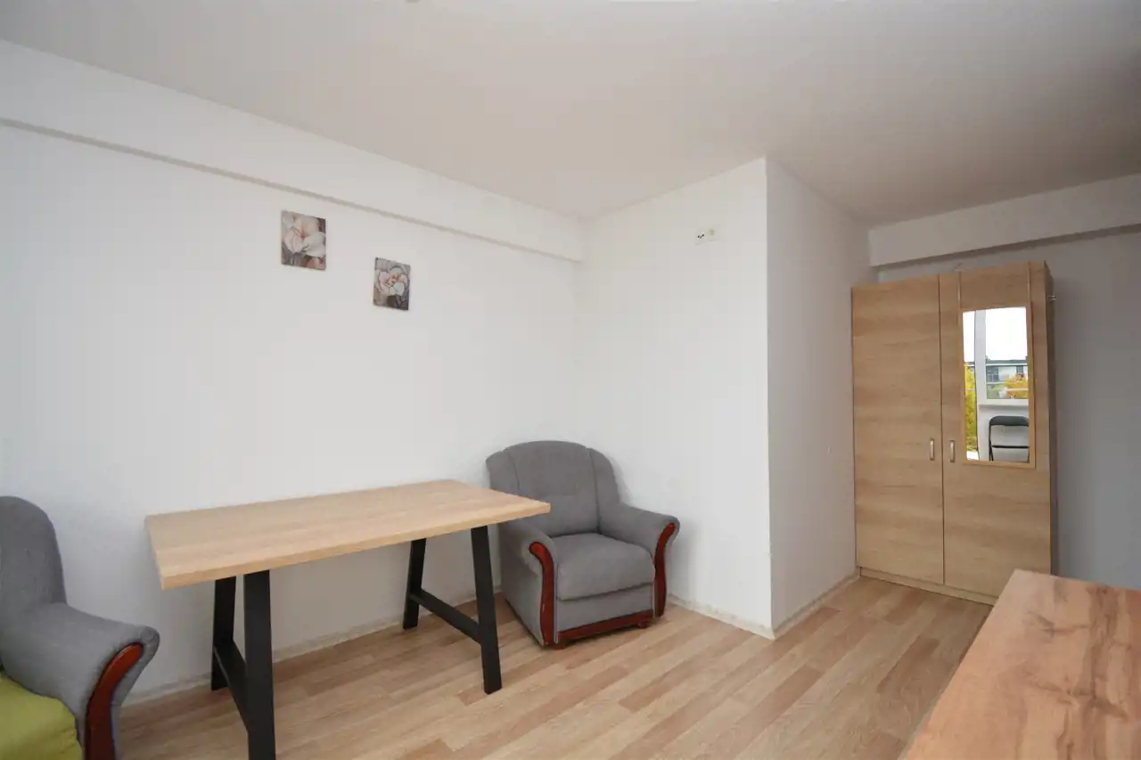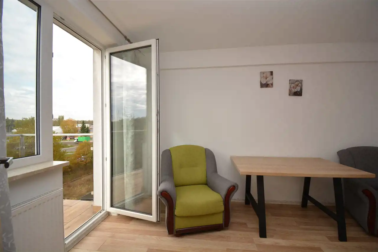 Pokój dzienny z balkonem i widokiem na zieleń otaczających drzew, obecnie pięknej jesieni. Do dyspozycji wygodny duży stół z fotelami, komodą i sporą szafą na ubrania. Możliwość podłączenia TV, światłowód w budynku.
