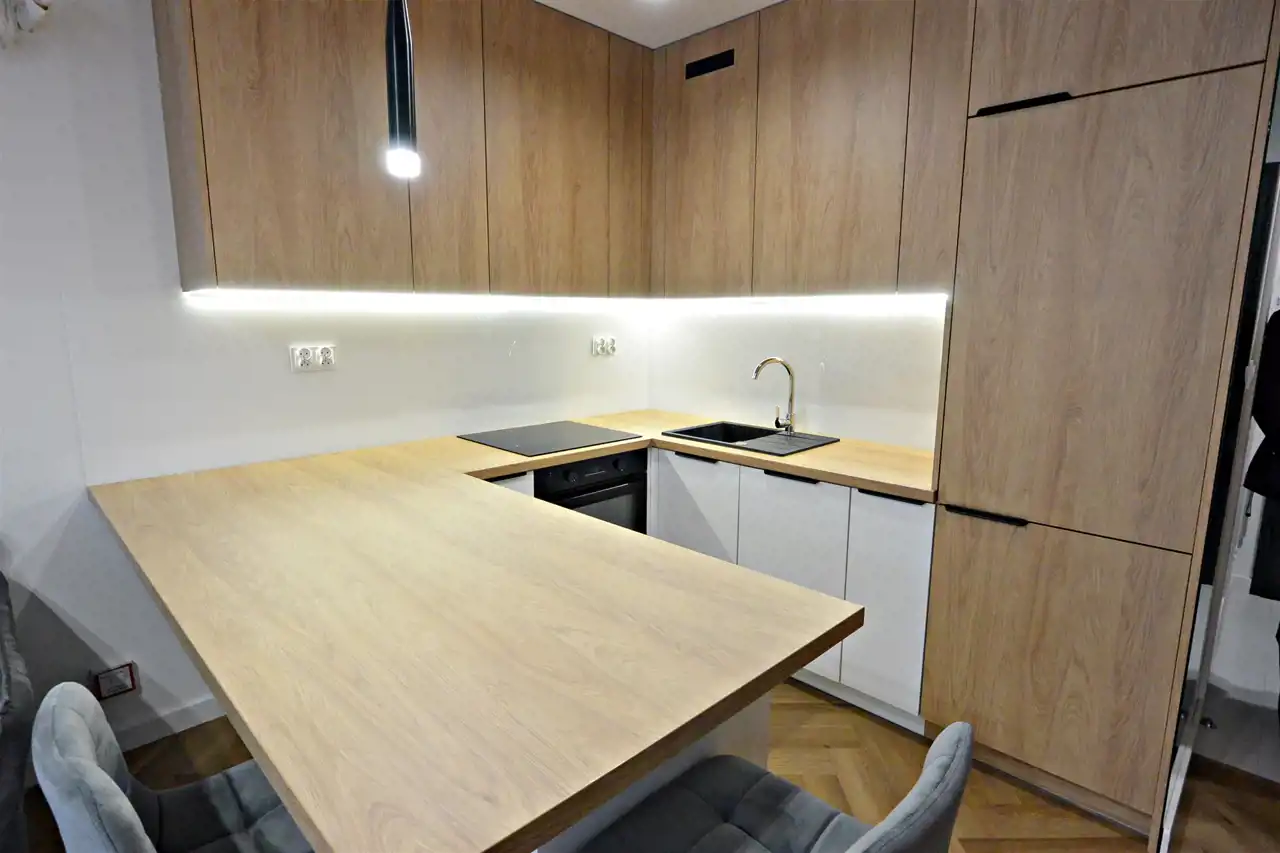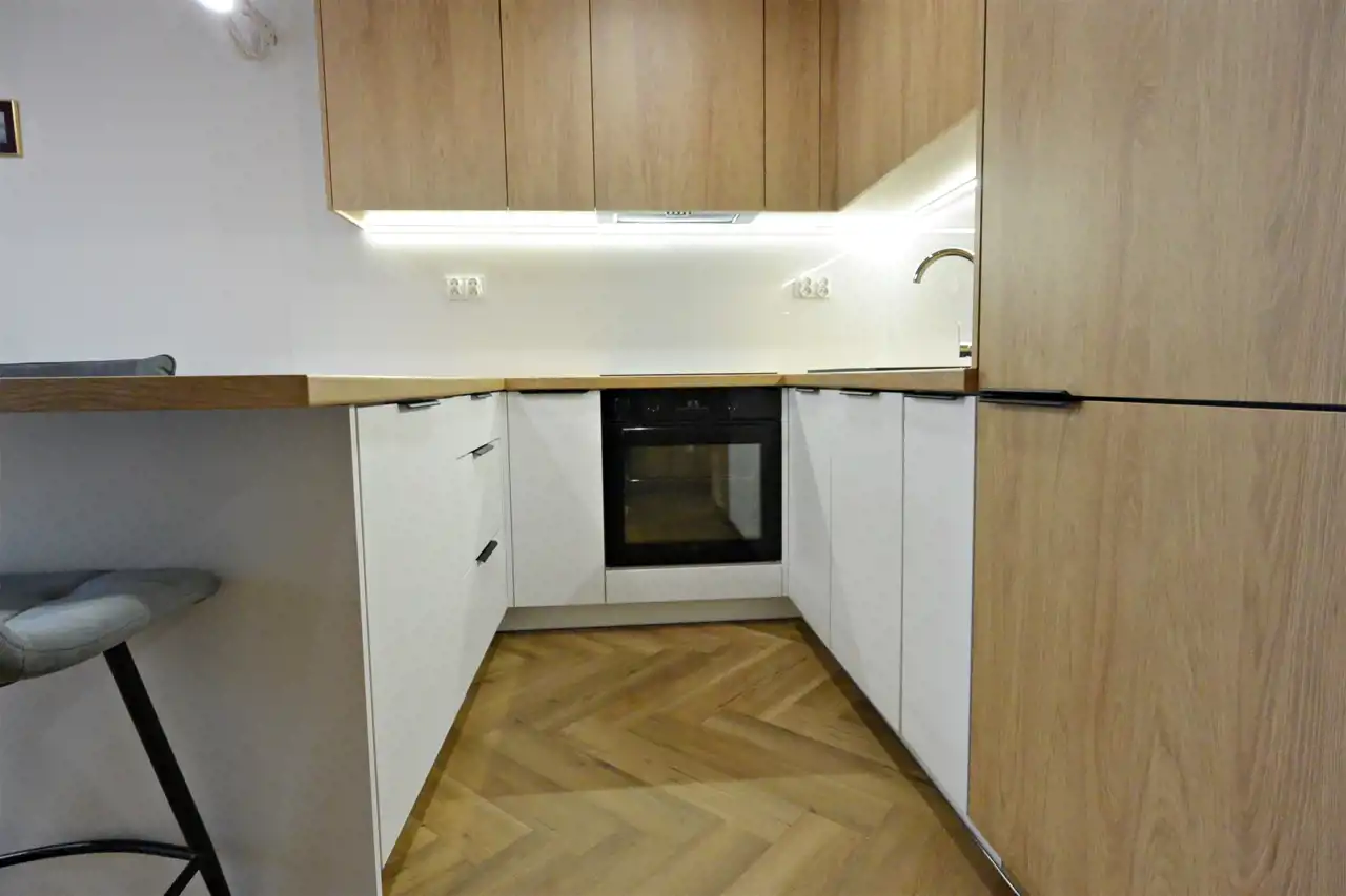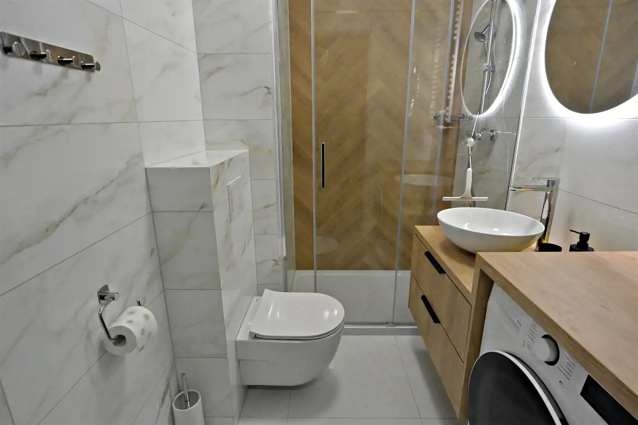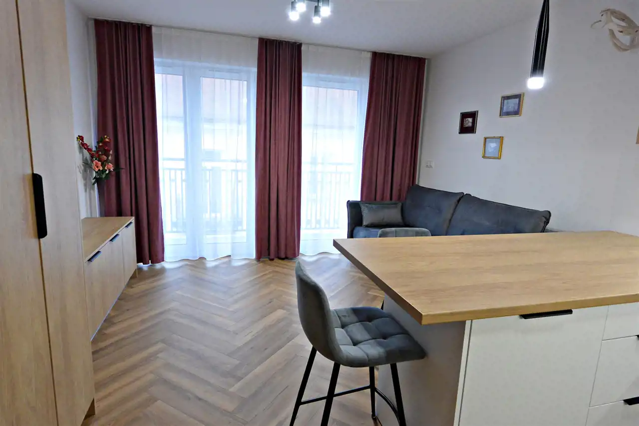 Mieszkanie jest świeżo wykończone, nigdy niezamieszkałe, wyposażone w sprzęty AGD, jak: lodówko-zamrażarka, zmywarka, piekarnik, płyta indukcyjna, pralko-suszarka oraz w pełni umeblowane.
