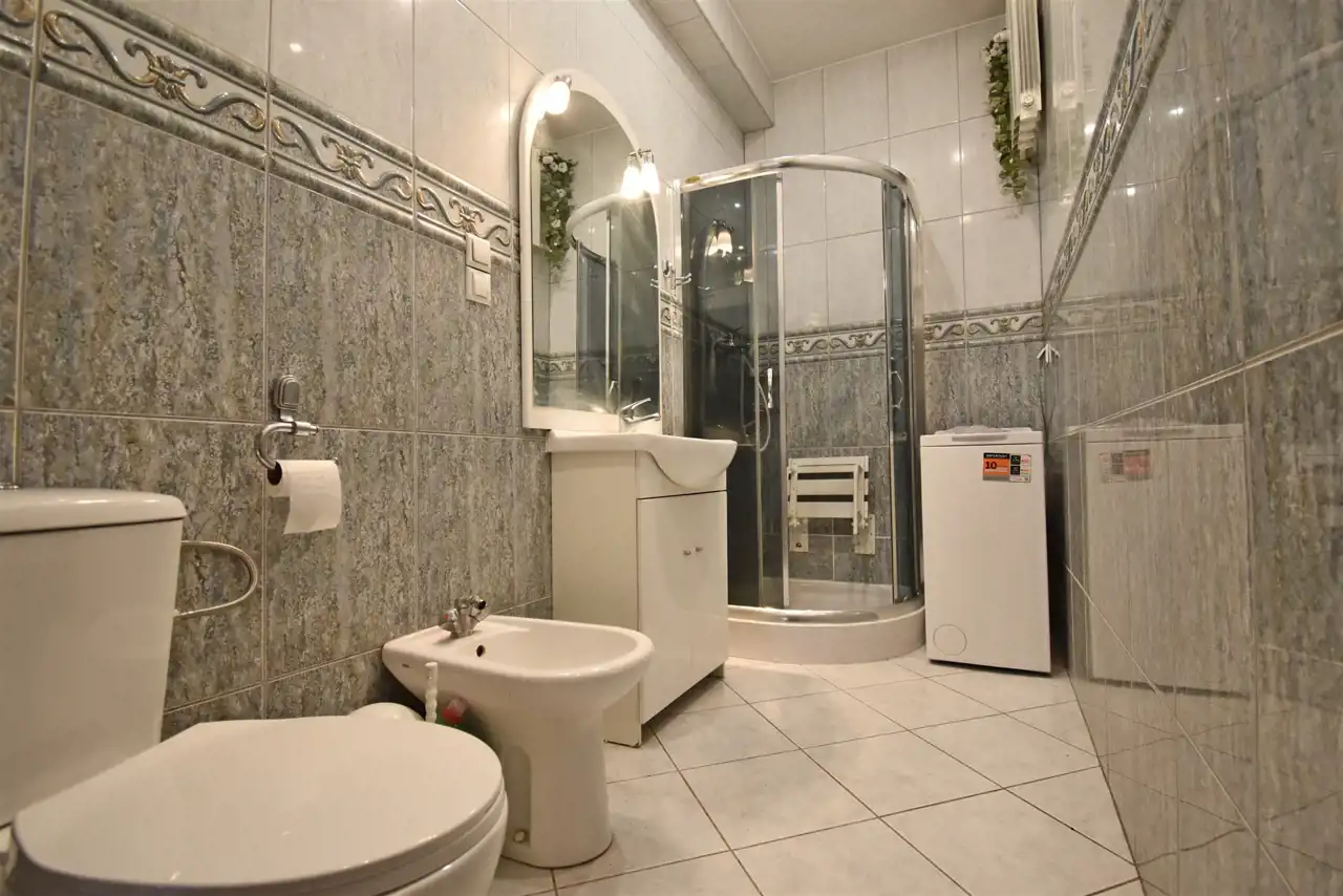 - łazienka z prysznicem łącznie z WC, wyposażona w pralkę,