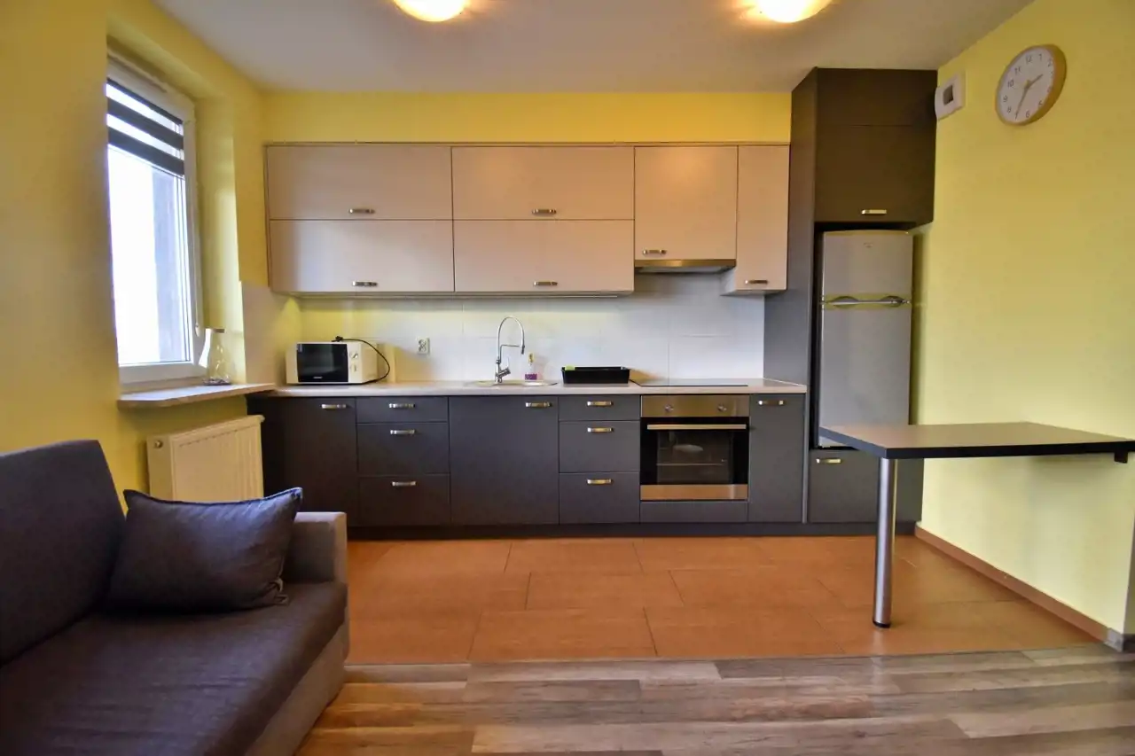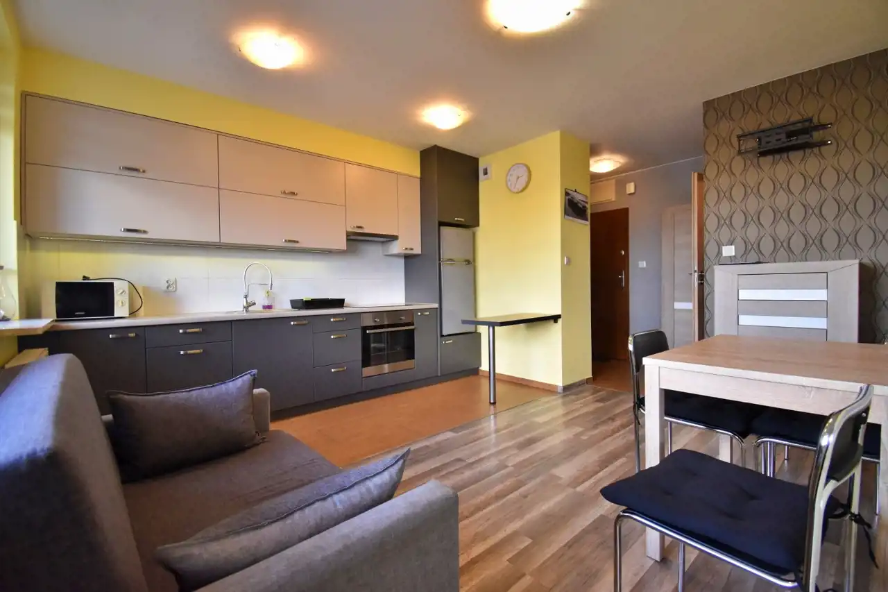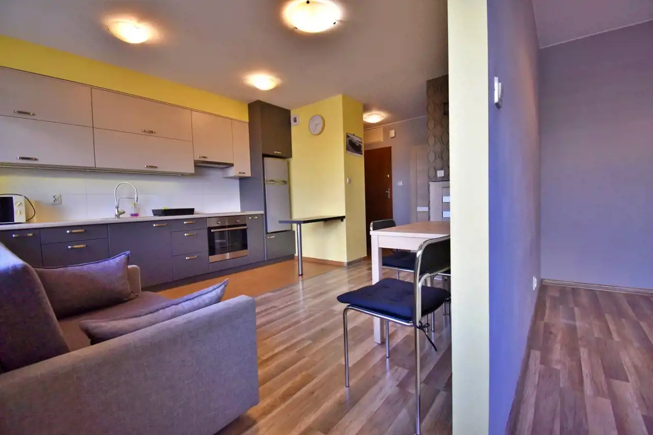 Mieszkanie wykończone przy użyciu wysokiej jakości materiałów, w pełni umeblowane i wyposażone w sprzęt AGD i niezbędne przybory kuchenne (gotowe do wprowadzenia).